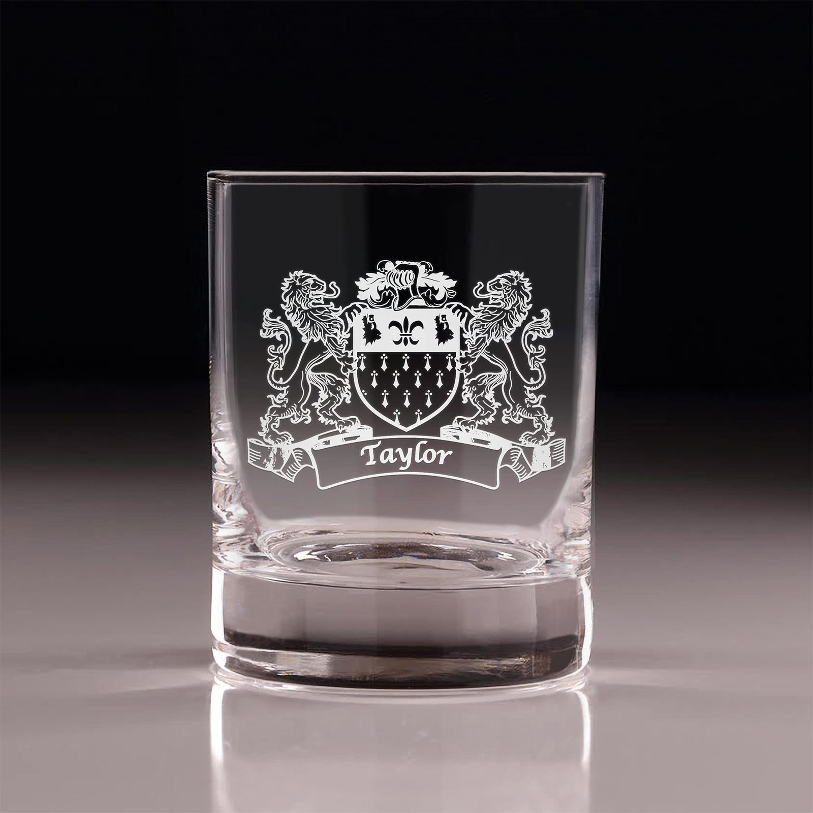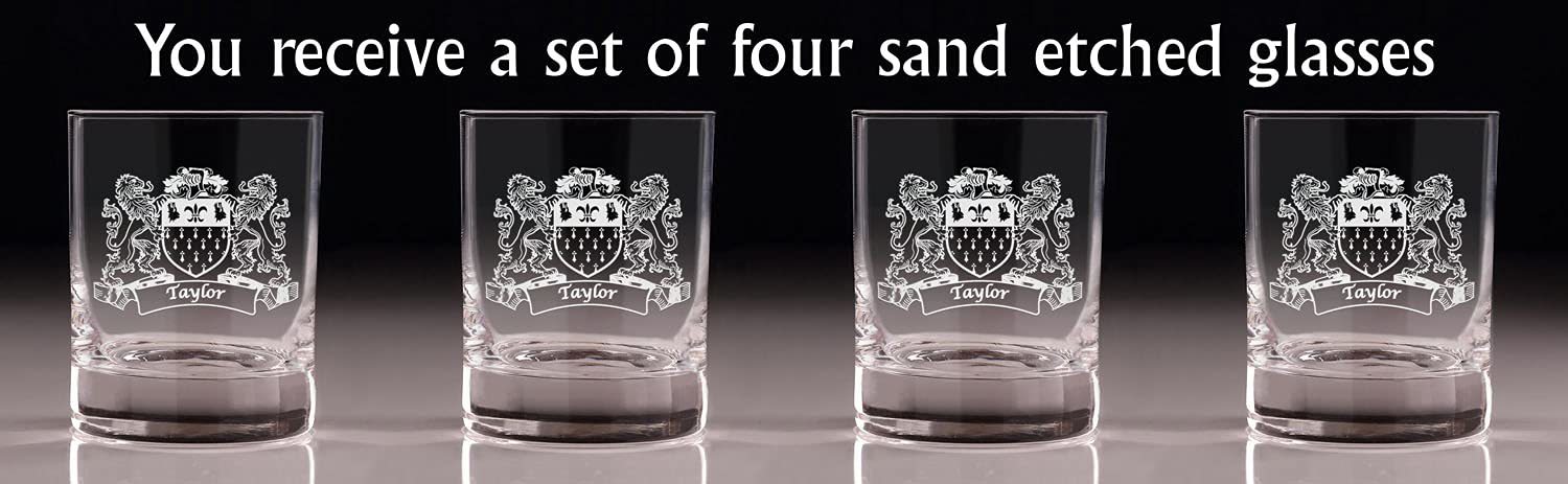 Taylor Irish Coat of Arms Old Fashioned Tumblers - Set of 4. Sometimes, bigger is better! These taller, wider tumbler glasses are perfect for craft cocktails and whiskey. It's larger size allows room for our fan favorite "Lions" design, which is expertly and permanently sand-etched into each tumbler with your very own Irish Coat of Arms and Surname! These lavish Master's Reserve glasses undergo DuraTemp treatment to increase chip resistance, feature a clean beadless rim, thin walls, and a heavy base with a luxurious feel. Each glass was made to complement your finest whiskies and elevate the presentation and experience of your drink.