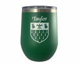 Taylor Irish Coat of Arms Stemless Wine Travel Tumbler - Green. Bring your drink and your Irish pride with you wherever you go with this beautiful travel tumbler. We expertly laser your very own authentic Irish coat of arms and surname into the tumbler's side to reveal it's design in stainless steel. With each mugs metal insulation, your beverage will stay cooler or hotter longer. Comes with a removable lid. Over 1000 available Irish coat of arms names.