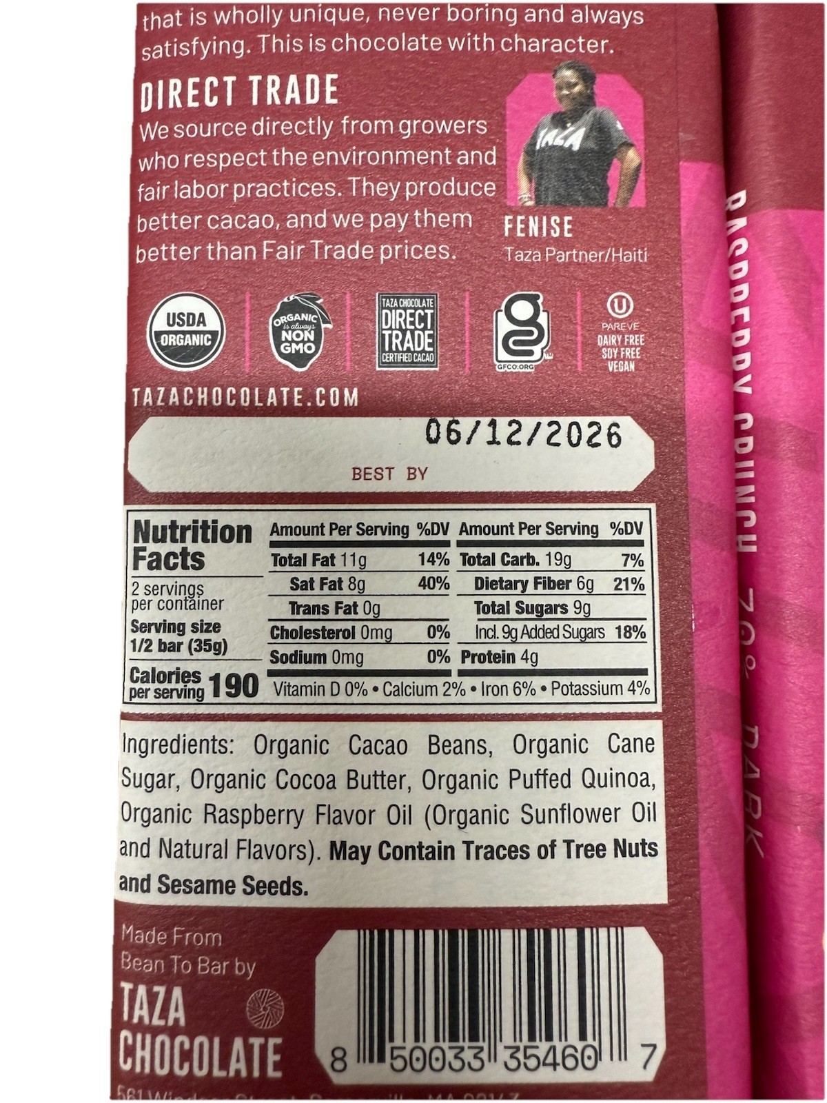 Organic Cacao Beans, Organic Cane Sugar, Organic Puffed Quinoa, Organic Cocoa Butter, Organic Raspberry Oil (Organic Vegetable Oil and Natural Flavors).