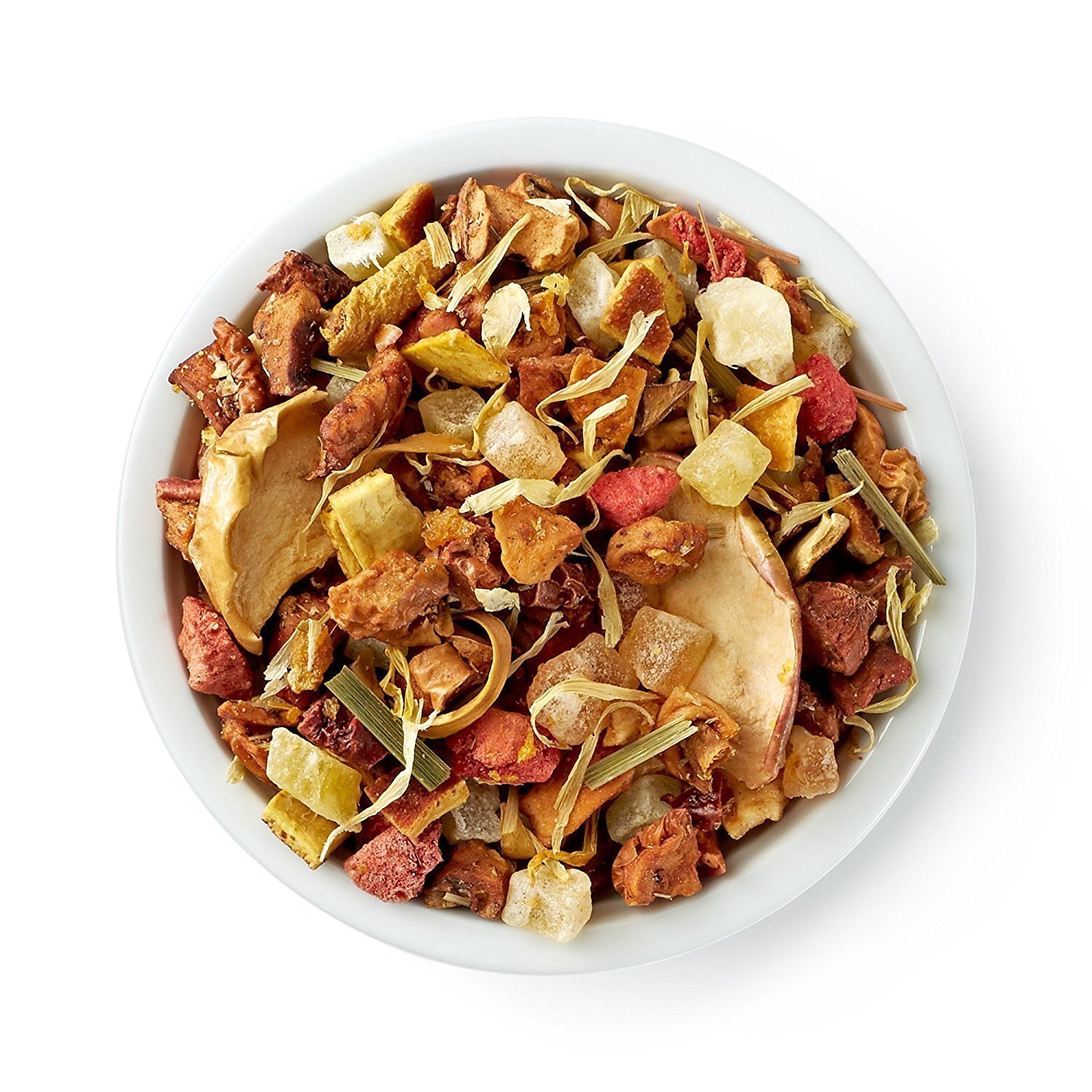 Apple pieces, orange peel, natural flavors, mango pieces (mango, sugar, citric acid), papaya pieces (sugar, papaya, citric acid), pineapple pieces (sugar, pineapple, citric acid), licorice root, lemongrass, marigold, malic acid, citric acid.