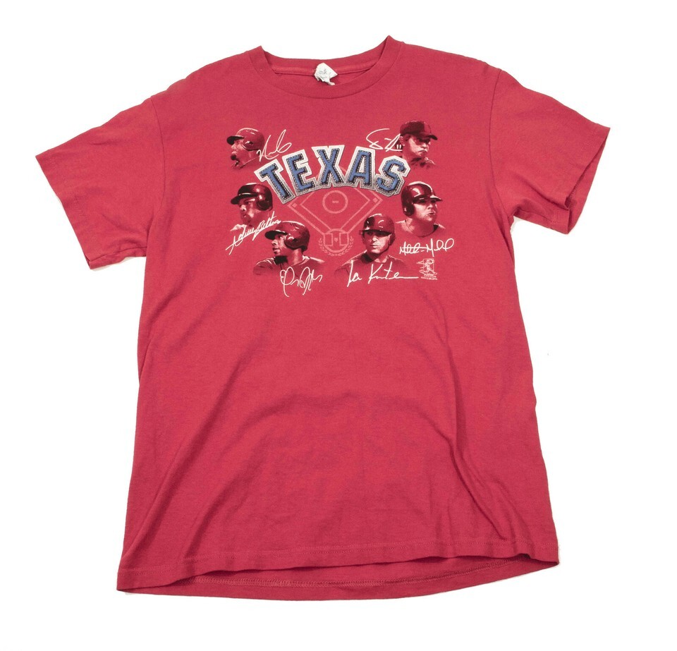 EUC, Preowned Red Texas Rangers 2013 Players Choice Team. Has Texas in blue white and black letters across the front along with the playing field in light white outline.Players and their signatures are in excellent condition on the front of the shirt. On the back is Texas 2013 with the players listed along with their numbers and positions played. Brand Delta Pro Weight Made in Mexico Solid red background with graphics Texas with players pictures on the front Texas with 25 players numbers and names on the back 100% preshrunk cotton Crew neckline Machine wash inside out cold water and tumble dry low SKU BT-3-0-029 Yes, we combine orders for shipping whenever possible. If did not combine the shipping on your order correctly when we combine the items and check the shipping, if it is less than the shipping charges that you paid, we will issue you a refund for the difference.