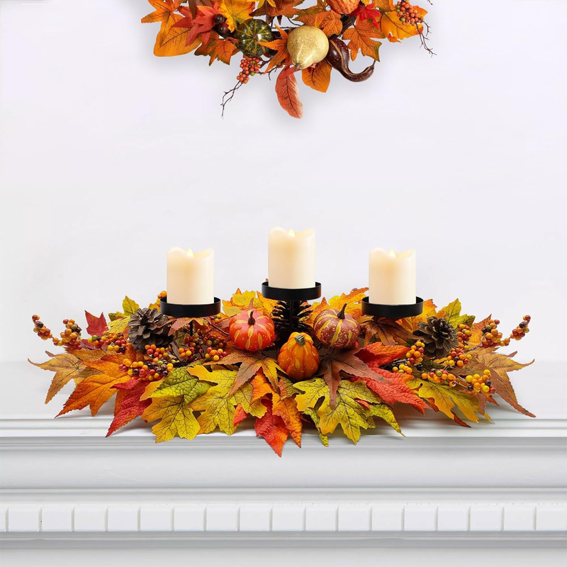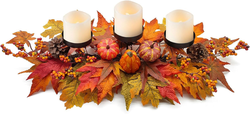 Thanksgiving Centerpiece Fall Table Decorations, Artificial Gourd, Pumpkins, Pine Cones, Maple Leaves and Berries Harvest Table Candle Holder for Dinning Table, Fireplace Mantel (Candle Not Included)