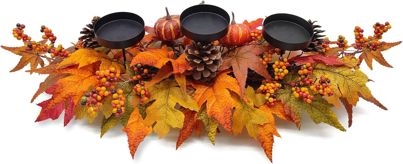This fall centerpiece table decoration is made with artificial pumpkins and gourd, natural pine cones, faux maple leaves, red small berries. The combination reflects classic fall harvest elements and theme. The measurement of the whole is approximately 27.5" L x 10" W x 6" H. Each metal candle holder plate?s diameter is 3.2??, so the diameter of a candle should not exceed 3??(candles not included). Three candle holder plates are made of metal and surface painting black, which guarantees it will not to rust easily. Mixed artificial handmade ornaments are foam and polyester fibre, it is safe to use. Fresh looking floral that never fades, the centerpiece will keep fresh all the way. You could conveniently wipe with a damp rag when it is covered in dust. Its durable materials make it a long-lasting investment. The table is where family and friends gather in the festive Thanksgiving. Decorate your fall dinner table in delightful festive with this traditional handcrafted centerpiece with pillar candles or tealights.
