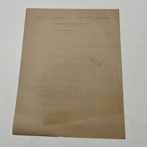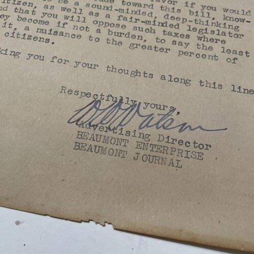 The Beaumont Enterprise Letter 1930 Texas Tabacco Tax To State Representative.