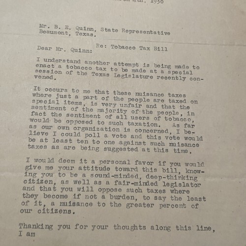- The Beaumont Enterprise Letter 1930 Texas Tabacco Tax To State Representative