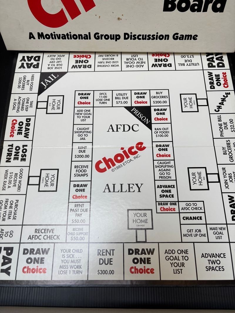 This game seems to be from the 1980s or early 1990s, given references to "AFDC" (Aid to Families with Dependent Children, a U.S. welfare program phased out in 1996). It may have been produced by a small publisher or organization focused on social work or personal development, possibly for use in welfare-to-work programs, addiction recovery, or life skills training.