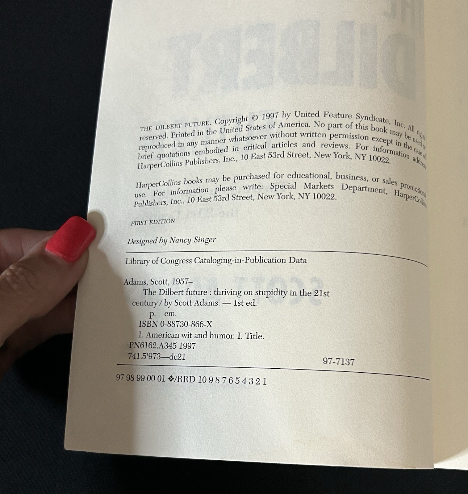 FIRST EDITION! The Dilbert Future - Thriving on Stupidity in the 21st Century soft cover book. I acquired this book from a storage unit clean out. The lower right corner has very light discoloration on a few of the page corners. Please see close-up picture for detail. We very much appreciate you taking the time to view our items. Our goal is to have 100% positive feedback and deliver excellent customer service. Please let us know if you have any questions before making your purchase. We look forward to doing business with you. In regards to shipping, my rule is to pack it like I would like to receive it myself. I typically use USPS for most items, but I prefer to use FedEx (ground/home) for fragile items, as I have had the post office break fragile items from time to time.