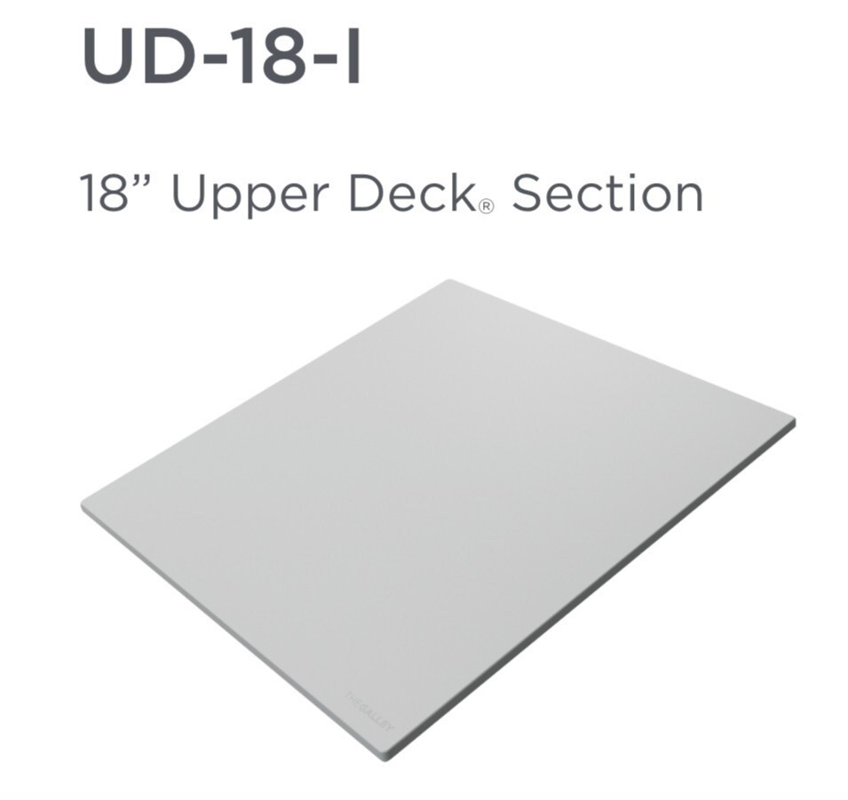 The Galley Exclusive Gray Resin 18" Upper Deck Section UD-18-1-GR Our Exclusive Gray Resin is the perfect gray color for so many modern kitchens today. Like the Designer White resin, it is ?? thick and not only easy to maintain and dishwasher safe, but is indoor and outdoor/UV rated and gentle on knives. Brand New Next Day shipping 19? deep Cover system and third tier work surface Sits in 18? deep** Requires 1/4? clearance below countertop surface **Upper Deck section sits above countertop: WA: 1/2? BA: 1/2?, GT: 1/4?, GR WH: 3/8?