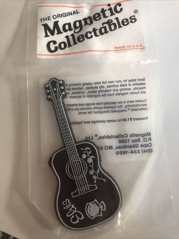 The product is a magnetic collectible guitar featuring Elvis Presley, a legendary figure in the music industry known for his contributions to rock and pop music. The guitar is sealed, adding to its value and appeal as a piece of entertainment memorabilia for fans of Elvis and collectors of music memorabilia. This novelty item offers a unique way for fans to showcase their admiration for the iconic artist.