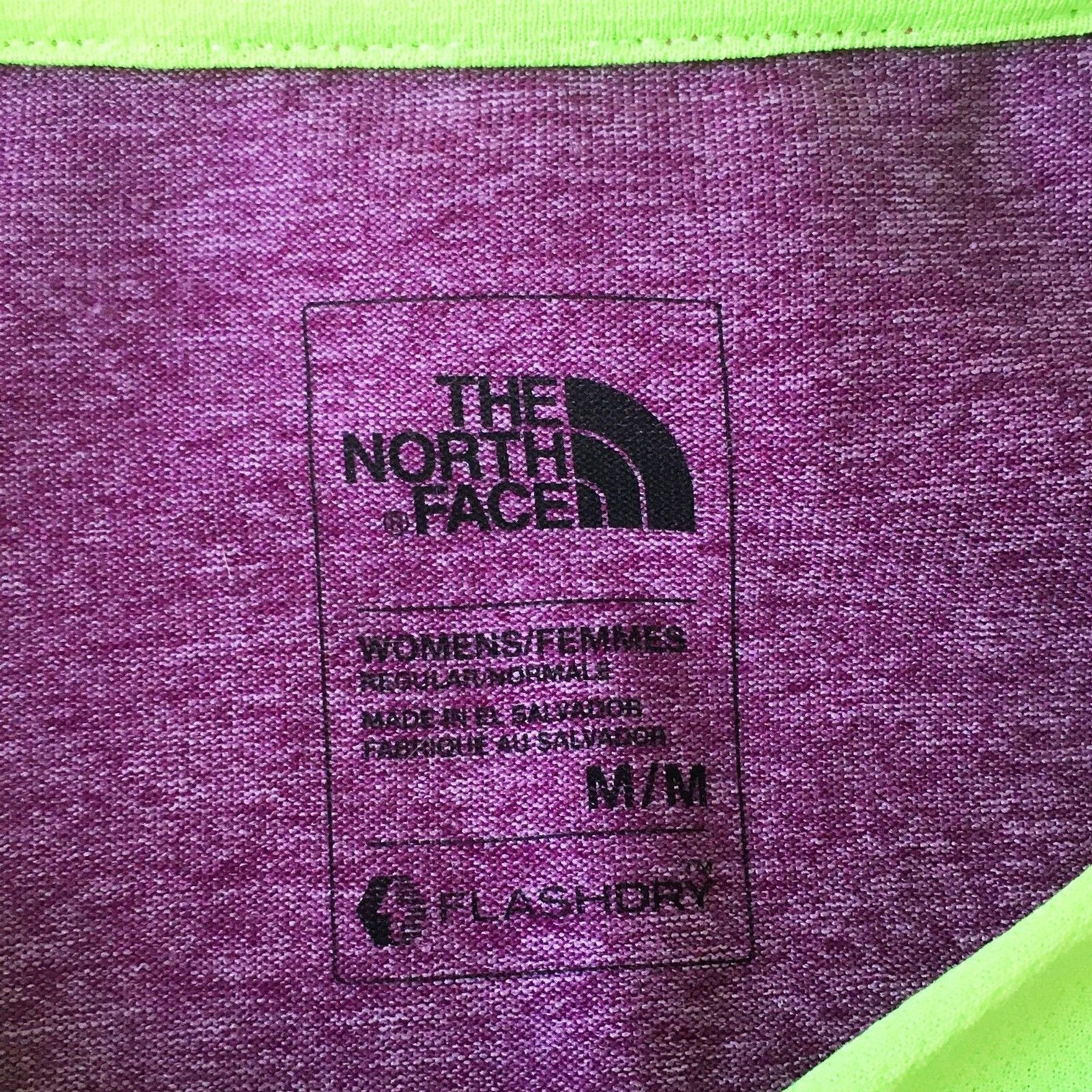 The North Face women's size Medium hoodie. Purple heather polyester pullover top is hooded with neon green lining and trim. Long sleeves with thumb holes. 100% Polyester, Machine Wash. Measurements are taken across flat, unstretched garment: Shoulders (seam-to-seam across the back): 16" Chest (underarm to underarm): 20" Sleeve (shoulder seam to cuff): 24" Overall Length (from nape of neck): 24-1/2"