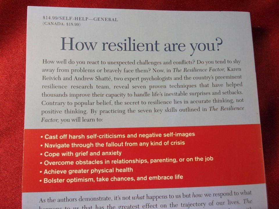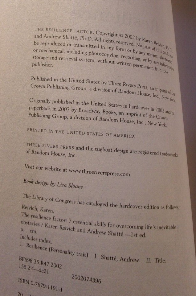 THE RESILIENCE FACTOR BY KAREN REIVICH, PH.D. ANDREW SHATTE PH.D. PAPERBACK BOOK CONDITION: LIKE NEW 342 PAGES PUBLISHED: 2003 DEFECTS: NONE PLEASE REFER TO PHOTOS JUNE 02, 2022 MAKE AN OFFER: WE NORMALLY REPLY WITHIN 24 HOURS THANK YOU FOR LOOKING AT OUR STORE WE ARE A PROUD VETERAN EMPLOYER, WE EMPLOY ALL BRANCHES, U.S. ARMY, U.S. AIR FORCE, USMC, U.S. NAVY AND CIVIL AIR PATROL. WE PROUDLY HIRE ALL VETERANS. WE SELL U.S. MADE MERCHANDISE MADE BY AMERICANS. SAVE ON SHIPPING BY BUYING MORE, WE DISCOUNT SHIPPING IF YOU HAVE MORE THEN ONE ITEM, IT WILL SAVE YOU MONEY AND IT WILL SAVE US MONEY. WE ARE FAST FAST FAST SHIPPERS: WE SHIP SAME DAY NORMALLY, IF YOU PURCHASE AFTER 5 PM WE WILL SHIP THE NEXT MORNING TO INCLUDE SATURDAY AND SUNDAYS, WE HAVE A COURIER PICKUP DAILY. WE HAVE A NO HASSLE RETURN POLICY, IF YOU HAVE A ISSUE WITH ANY ITEMS IN MY STORE, SIMPLY CONTACT US AND I WILL FIX IT. WE SEND TO INTERNATIONAL BUYERS IF THE ITEM MEETS THE REQUIREMENTS. ALL ITEMS IN MY STORE CAN BE SHIPPED INTERNATIONALLY VIA THE GLOBAL SHIPPING PROGRAM. ALL TAXES AND ADDITIONAL COUNTRY REGULATED FEES ARE THE RESPONSIBILITY OF THE INTERNATIONAL BUYER. EXCEPT FOR RESTRICTED COUNTRIES, WE WILL SEND IT TO THE SHIPPING CENTER IN KENTUCKY, AND WILL SEND IT TO YOUR ADDRESS IN YOUR COUNTRY. INTERNATIONAL BUYERS CANNOT BUY ANY MILITARY ITEMS IN MY STORE, OR ANY RESTRICTED ITEMS THAT DEEMS RESTRICTED. THE GLOBAL SHIPPING PROGRAM ALLOWS INTERNATIONAL BUYERS TO PURCHASE FROM UNITED STATES SELLERS LIKE MYSELF; TO ENROLL, SIMPLY CALL.