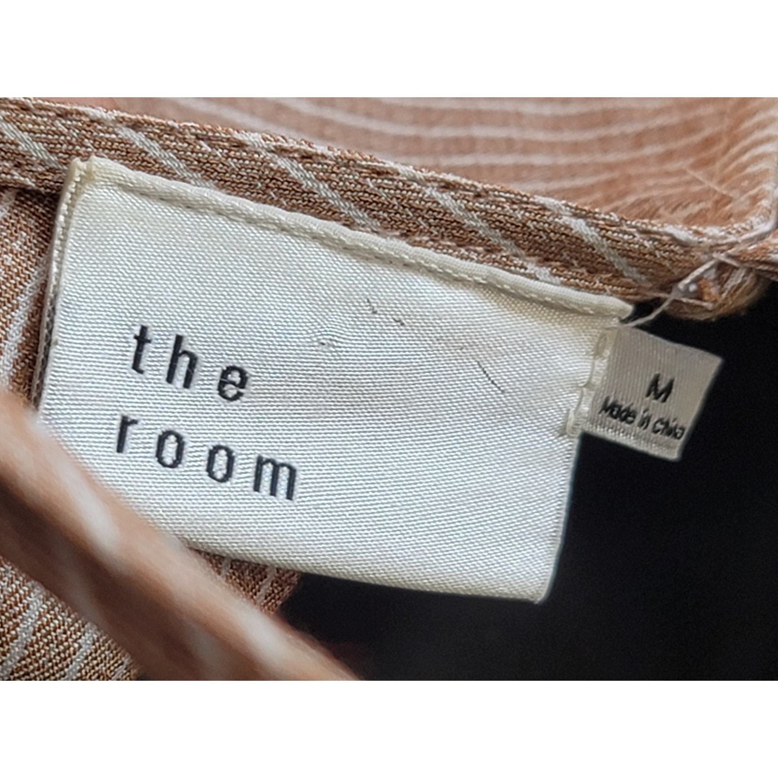 The Room women?s jumpsuit in size medium. Designed in a beige and white pinstripe pattern, it features adjustable spaghetti straps, a front twist cutout detail, and wide-leg pants for a flattering fit. Perfect for summer parties, vacations, or casual outings, this sleeveless jumpsuit blends comfort with modern sophistication.