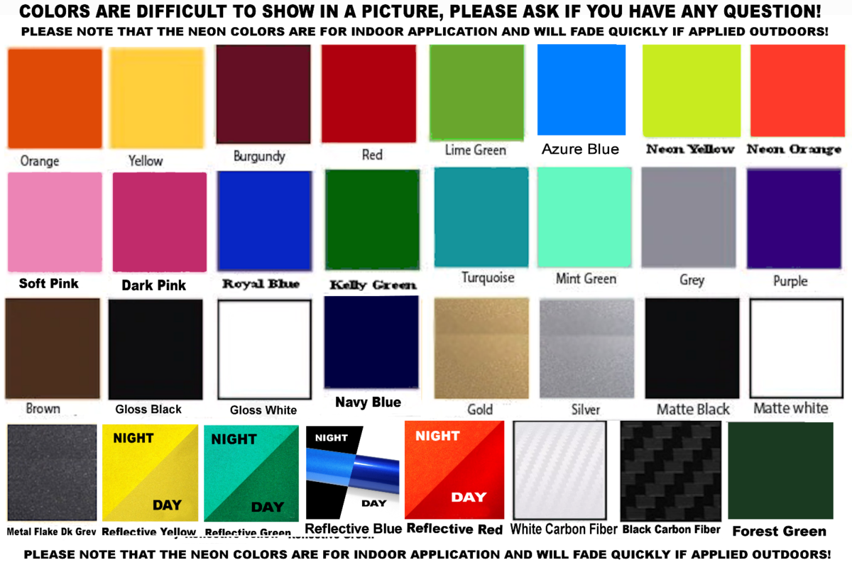 Gloss White (2500 in stock) Flat White (2500 in stock) Gloss Black (2500 in stock) Flat Black (2500 in stock) Red (2500 in stock) Brown (2500 in stock) Burgundy (2500 in stock) Gray (2500 in stock) Kelly Green (2500 in stock) Forest Green (2500 in stock) Lime Green (2500 in stock) Mint Green (2500 in stock) Royal Blue (2500 in stock) Azure Blue (2500 in stock) Navy Blue (2500 in stock) Orange (2500 in stock) Pink (2500 in stock) Dark Pink (2500 in stock) Purple (2500 in stock) Gold (2500 in stock) Silver (2500 in stock) Turquoise (2500 in stock) Yellow (2500 in stock) Neon Orange (2500 in stock) Neon Yellow (2500 in stock) Black Carbon Fiber (2500 in stock) White Carbon Fiber (2500 in stock) Metal Flake Dark Gray (2500 in stock) Reflective Red (2500 in stock) Reflective Blue (2500 in stock) Reflective Green (2500 in stock) Reflective Yellow (2500 in stock)