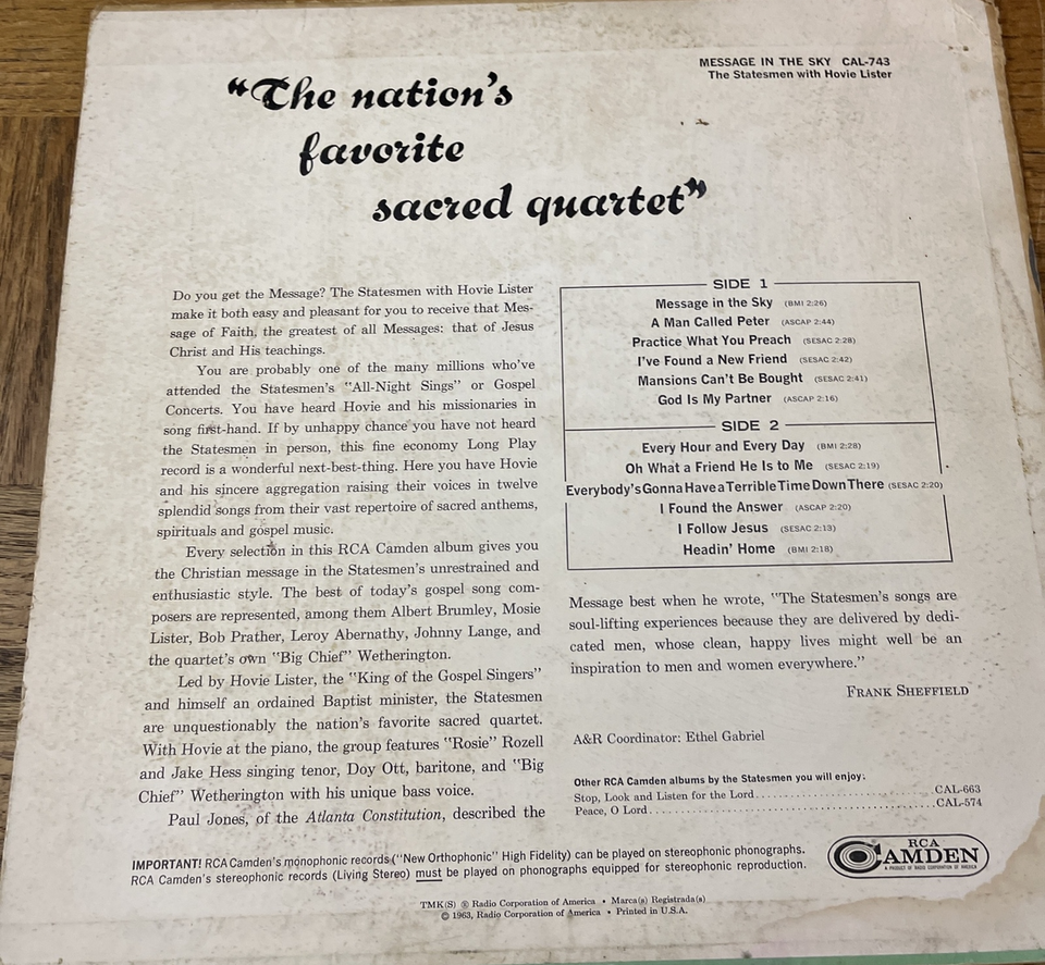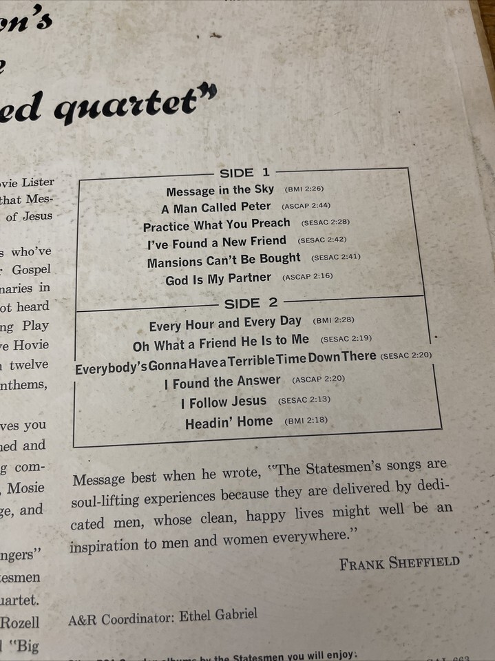 The Statesmen Message In The Sky Album LP-Rare Vintage-SHIPS N 24 HOURS