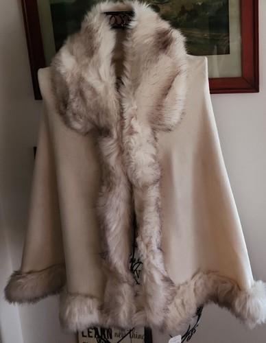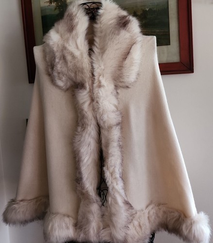 This sale is for a This That? Brand Cape ~ Shawl ~ Wrap ~ Sweater Winter White ~ Two Tone ~ first 3 stock photos show item to be much whiter than it truly is. It is closer in color to the last photos I took in the natural light. Multicolored ~ faux fur collar trim Women's ~ One size fits most Measurements taken while lying flat Height measures approximately 33? from top of back collar to bottom of hem Width measures approximately 18? with hook eye engaged at neckline ~ 30" at center 45" hemline (bell shaped) Hook eye closure @ neckline Without armholes sleeves Lightweight warmth Knit fabrication Body ~ 92% Acrylic ~ 8% Nylon Faux fur ~ 75% Acrylic ~ 25% Polyester This item is new with tags Please view photos for a good description of this item Thank you!