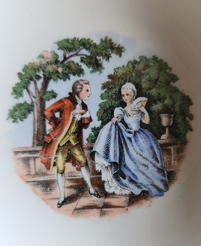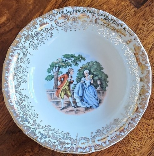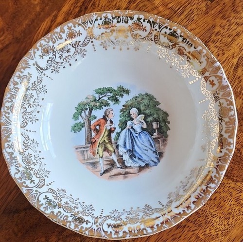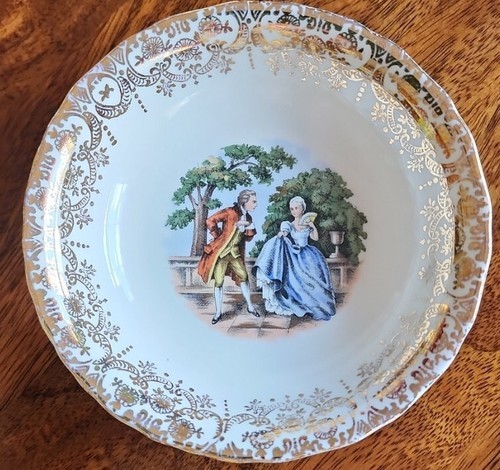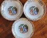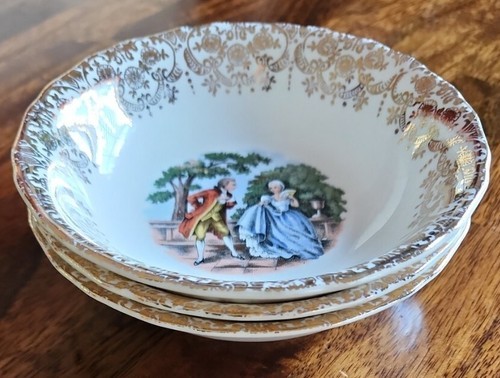 This Sale is for a Set of Three (3) Dessert Bowls Royal Queen China Victorian pattern featuring a courting couple Multicolored design Created in the 1940's and depicts scene of 18th-century man and woman Measures approximately 5" diameter x 1.25" tall 22K Gold Warranted filagree along the edges Slightly scalloped edge around rim Bowls are in good vintage ~ pre-owned condition ~ no chips ~ cracks or repairs Please view photos for a good description of these bowls Thank you!
