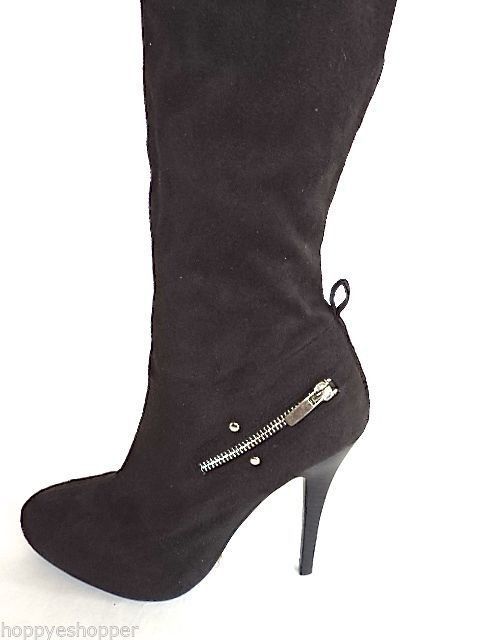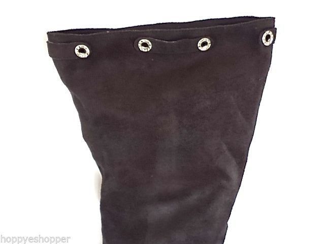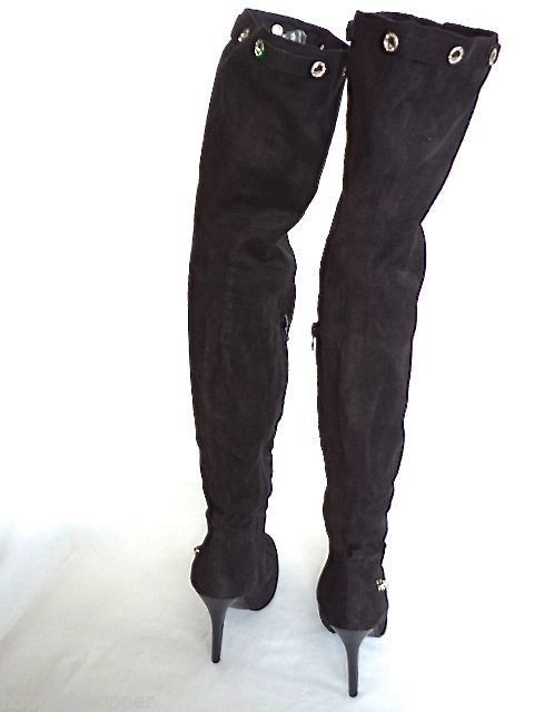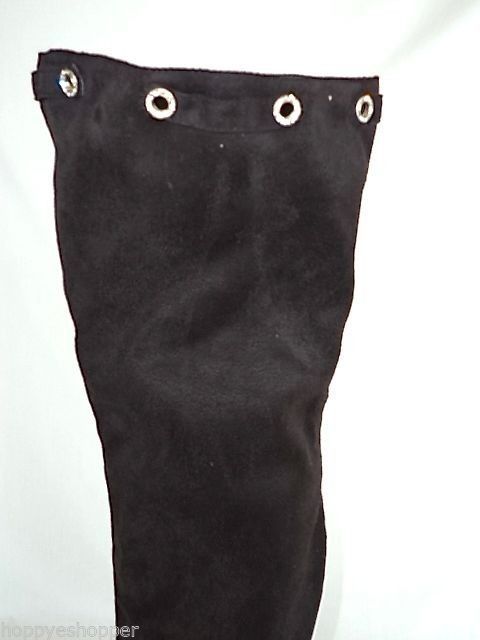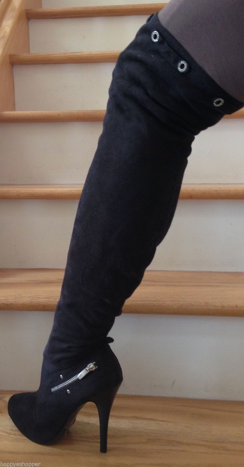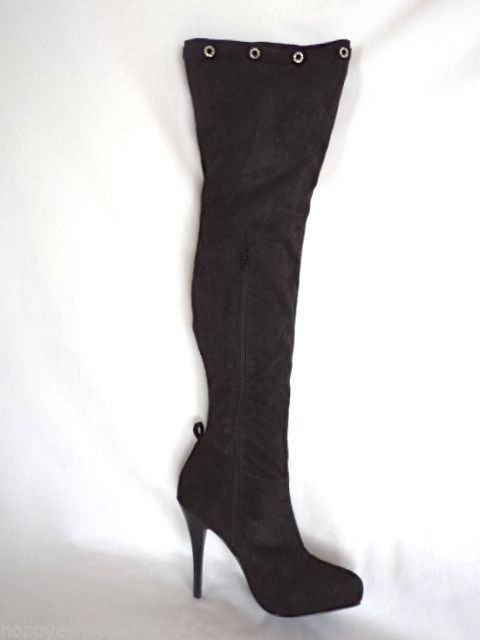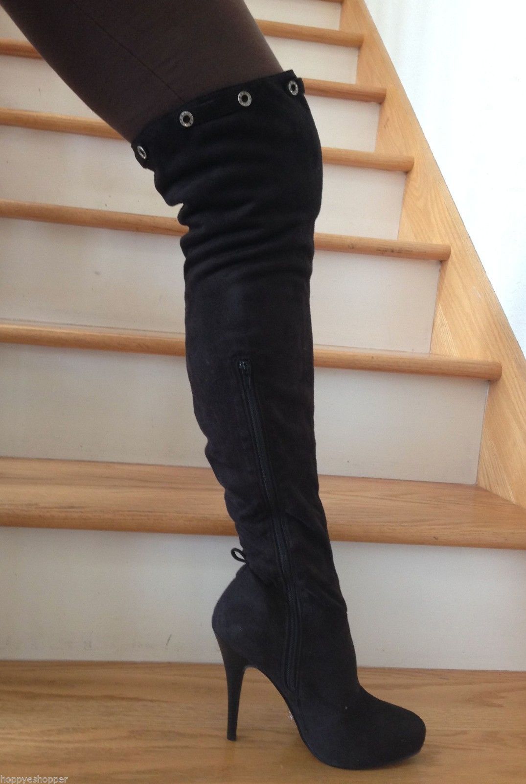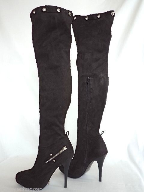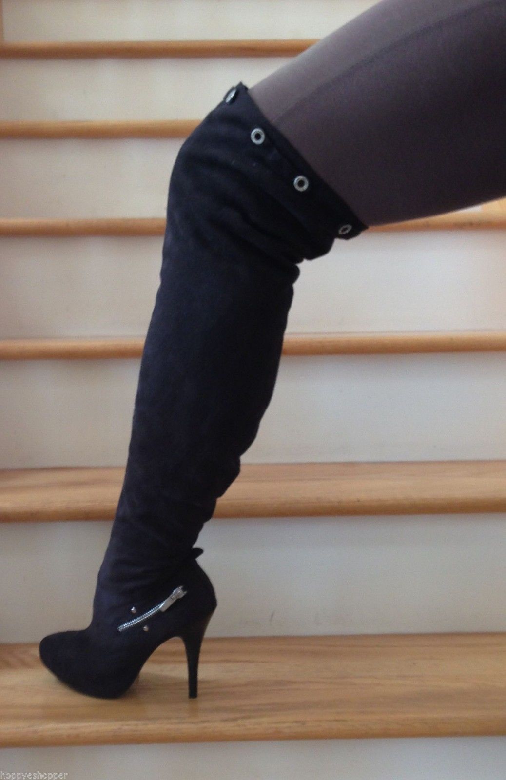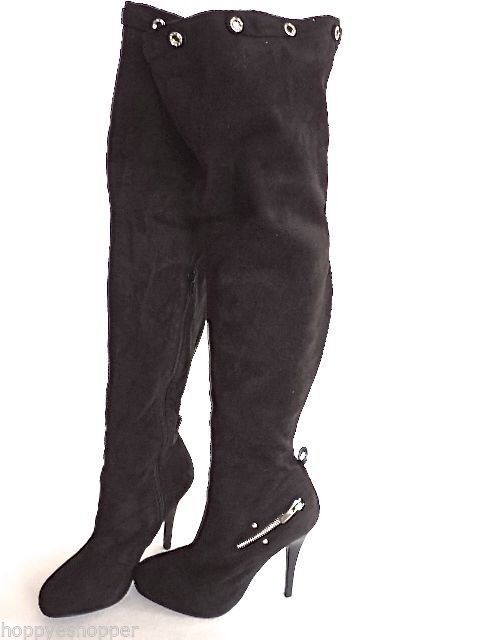 Sexy amazing thigh high stiletto heel boots by Promiscuous, style Furge. Also great for Halloween. Womens marked size 8 but will also fit 8.5 see above. Slouchy, side part zip easy to pull on. Stretchy fabric like suede but smooth satin like lining. Color: black Material: faux suede Shaft 22" plus 4.75" heel Top opening circumference 17" (approx) Inside length heel to toe approx 9.75-10" Embellished with a band of rhinestones on top, and decorative small metal zipper on side Pretty comfortable for stiletto See more unique items at our store BARGAIN SEEKERS INTERNATIONAL ONE STOP SHOPPING FOR ALL International Buyers ? Please Note: Import duties, taxes and charges (typically collected upon delivery or pick-up) are the buyer's responsibility and not included in the item price or shipping charges. Please check with your country?s customs office prior to bidding/buying to determine what these additional costs will be.