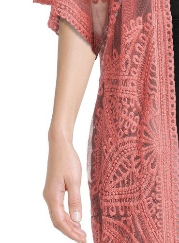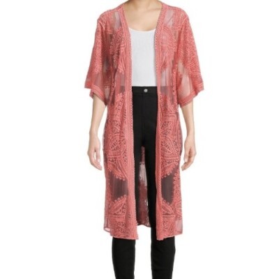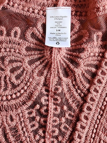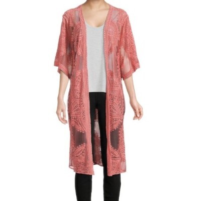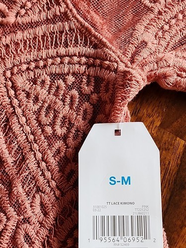 This Sale is for One (1) Time and Tru Wrap ~ Kimono ~ Layering Piece Women's Size Small/Medium (S-M) Pink Camellia in Color Lace body with a floral design throughout Measures approximately 22" armpit to armpit while lying flat ~ across backside Measures approximately 38" from shoulder seam to hem Measures approximately 12" from shoulder seam to end of sleeve Relaxed fit ~ generously cut with maximum wearing ease Open-front wrap ~ kimono ~ layering piece Half length sleeves 63% Cotton ~ 37% Nylon Machine washable Wrap ~ Kimono ~ Layering Piece is new with tags Please view photos for a good description of this item Thank you!