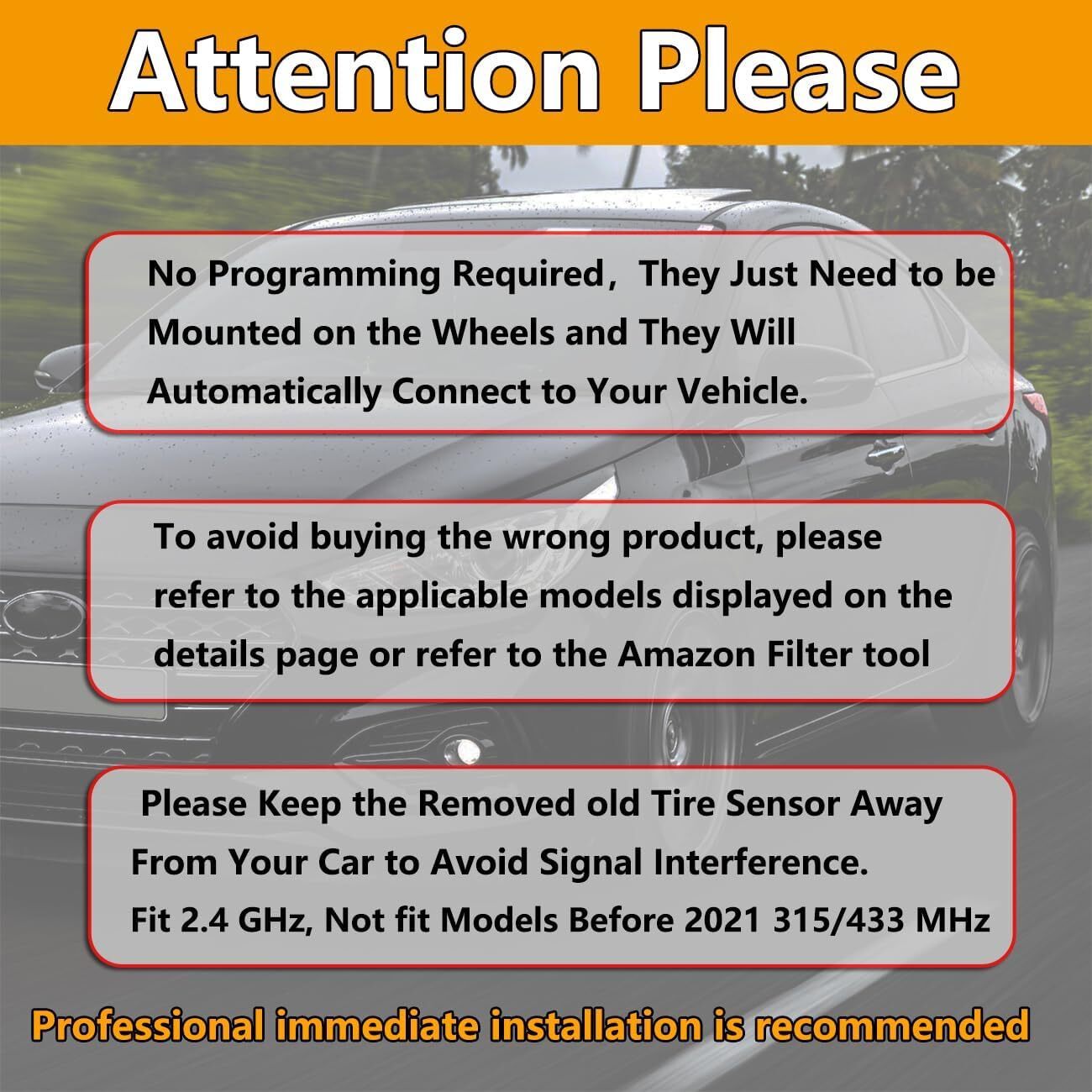 Fitment: Compatible with Model 3 (Built Oct 2020-Present); Model Y (All Model Y, since introduction in Oct 2020-Present); Model X / X Plaid (Refreshed Model, Oct 2021-Present); Model S / S Plaid (Refreshed Model, Jun 2021-Present) Install: No Programming Required, They Just Need to be Mounted on the Wheels and They Will Automatically Connect to Your Vehicle Note: Please Keep the Removed old Tire Sensor Away From Your Car to Avoid Signal Interference Fit 2.4 GHz, Not fit Models Before 2021 315/433 MHz, Operating Temperature: -40C + 125C Avoid buying the wrong product, Please use Amazon Part Finder above to verify fitment. Or Refer to the details page for specific applicable vehicles