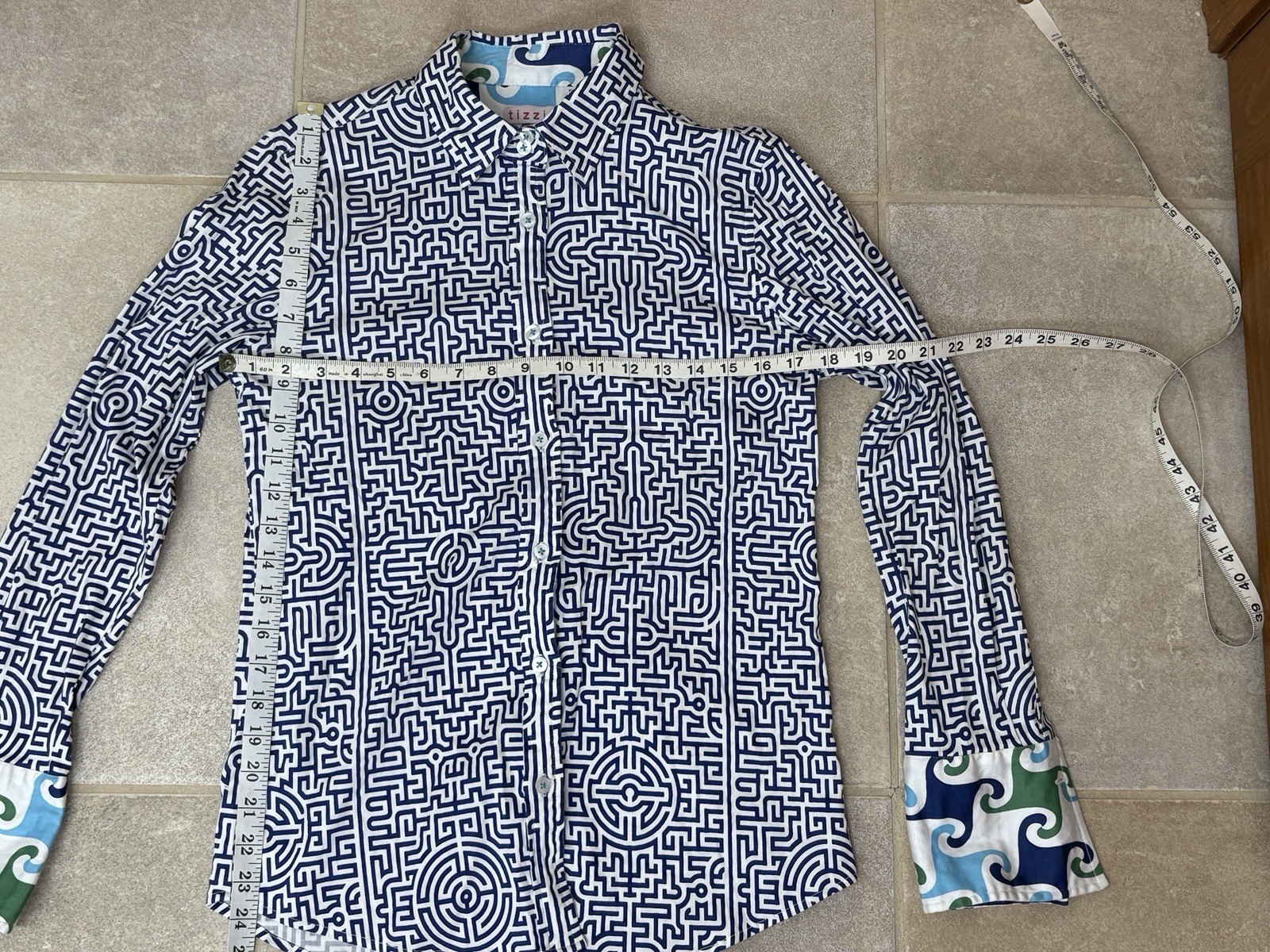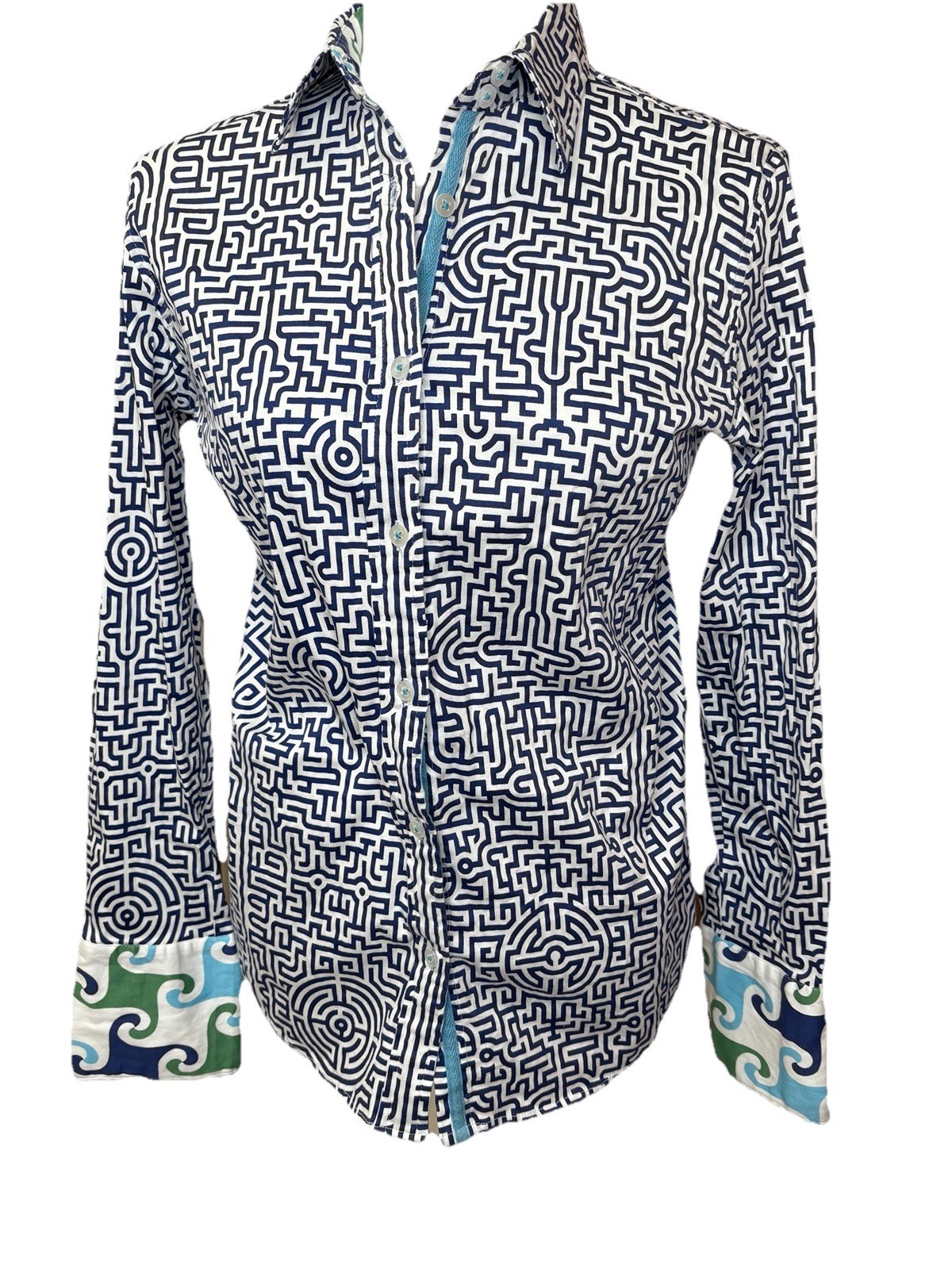 - Tizzie ButtonUp Shirt Sz M Geometric Contrast Cuff Nautical Career Artsy NOTE