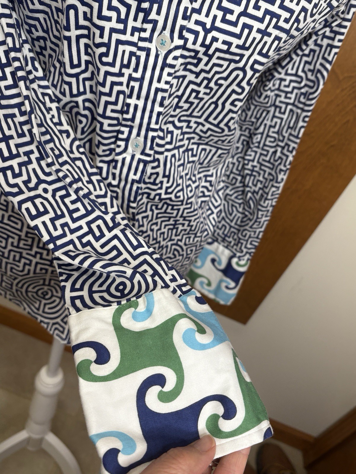 Tizzie ButtonUp Shirt Sz M Geometric Contrast Cuff Nautical Career Artsy NOTE