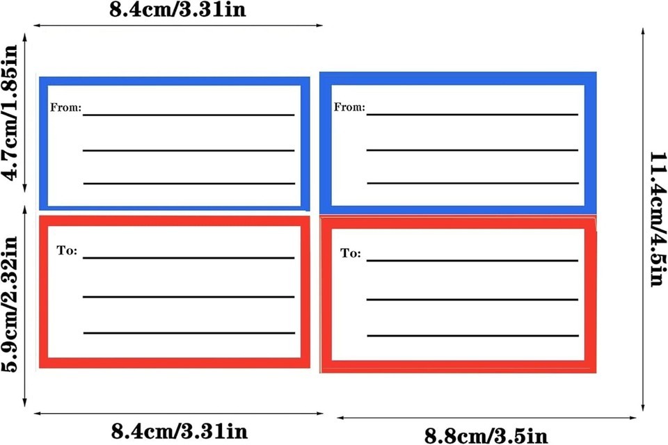 The size of the mailing address label is 3.5 x 4.5 inches, to/from address label with lines for writing,and mailing labels for envelope enough space for you to write the information of the products mailed to the designated place. Blank address labels suitable for use in mailing boxes or envelopes, shipping. The Self Adhesive Handwriting to/from Address Tags Stickers can be firmly attached to the mail and will not fall off easily. easy to write on,the ink does not smear.