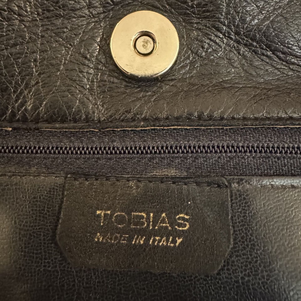 Elevated and roomy, this slouchy black leather tote by Tobias offers classic Italian craftsmanship with bold style. Designed with textured snake-embossed handles and chunky silver-tone chain hardware, it's a standout piece that blends structure with softness. Made in Italy Genuine leather exterior Slouchy silhouette with soft, unlined interior Decorative leather belt detail across front Zippered front pocket with snap overlay Large open main compartment Silver-tone chain and faux snakeskin top handles Measurements: 16" H 14" W 4.5" D Handle drop: 5.5"