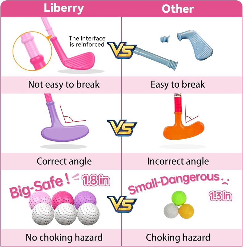 GREAT TOY GOLF SET: Liberry baby golf clubs set includes 1 golf cart, 3 golf clubs (putter, iron and wood. Putter and iron are also left-handed compatible), 2 holes, 2 flags, 2 golf tees, and 6 balls(3 white and 3 colorful)