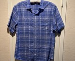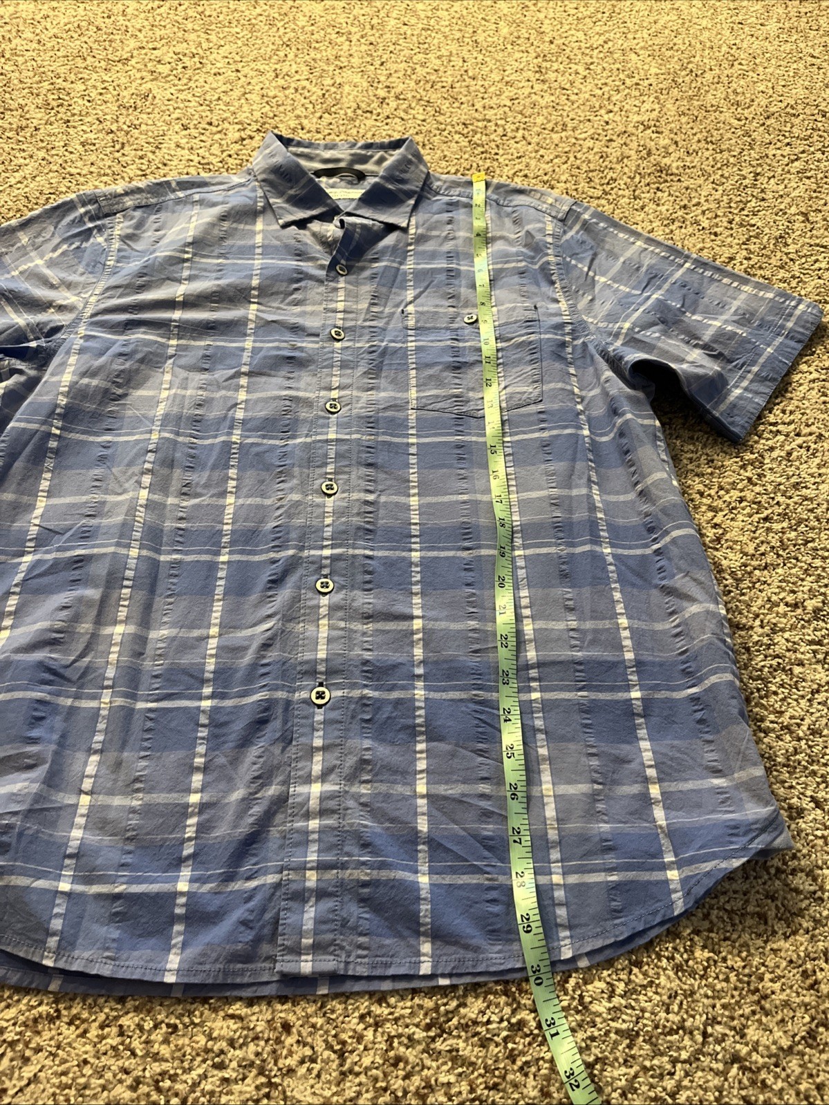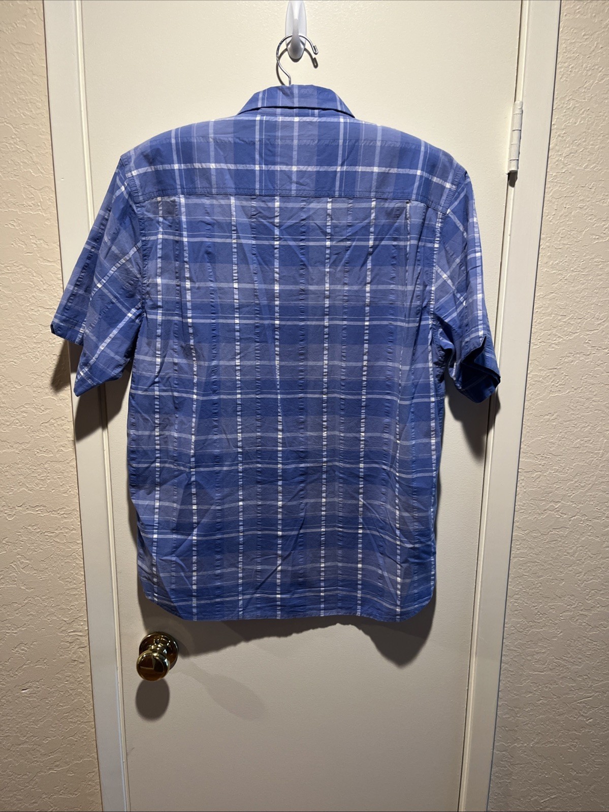This Tommy Bahama Men's Medium Blue Nova Wave Plaid Seersucker Short Sleeve Shirt is a casual button-up shirt perfect for any beach or tropical-themed occasion. Made from a blend of spandex and cotton, this lightweight and breathable shirt features a spread collar, short sleeves, and a solid blue color with a wave plaid design. Easy to care for with machine washable instructions, this shirt offers a comfortable regular fit with a touch of stretch for added flexibility. Perfect for all seasons, this Tommy Bahama shirt is a stylish and versatile addition to any man's wardrobe. Shirt is in very good condition, from a smoke free home. See pics for measurements and condition.