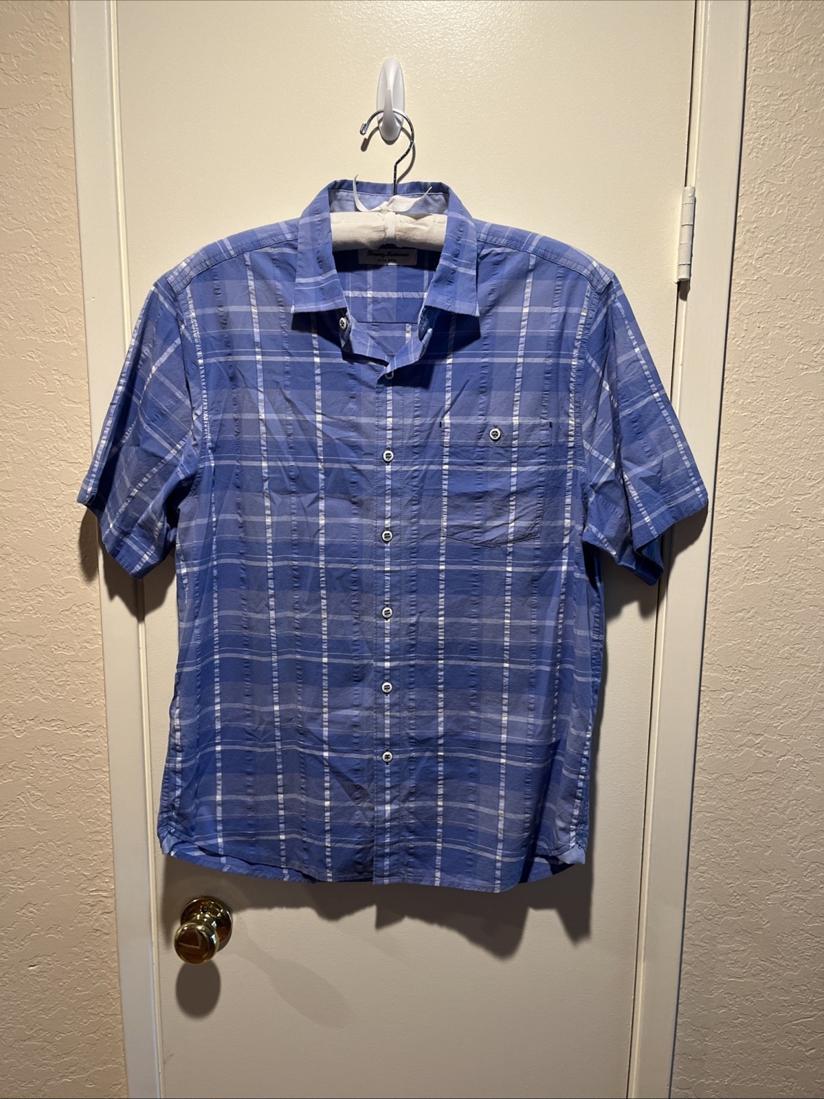 Tommy Bahama Shirt Mens Medium Blue Nova Wave Plaid Seersucker Short Sleeve