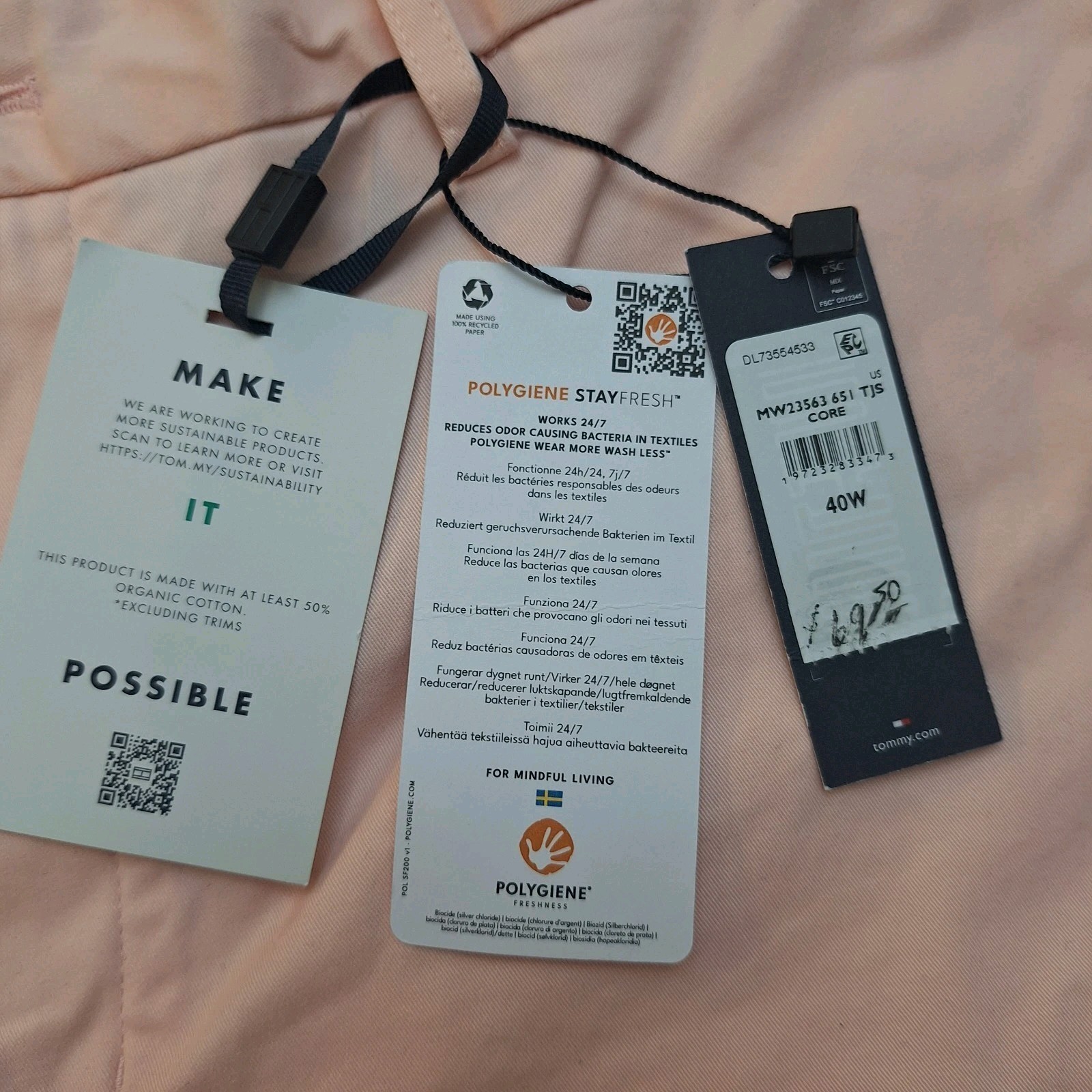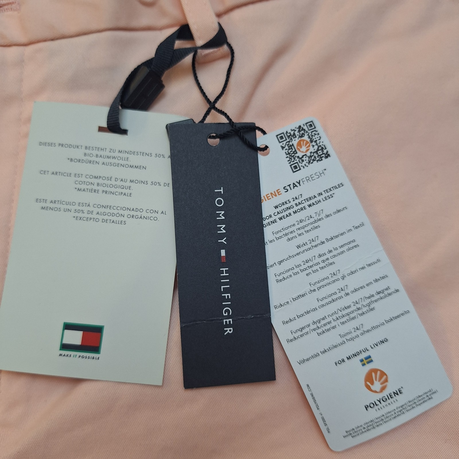 The Tommy Hilfiger Brooklyn Men's Shorts in size 40 are a stylish and versatile addition to any man's wardrobe. Made from a comfortable cotton blend fabric with a light wash, these shorts feature a button and zip closure, a 11.5" rise, and a 9.5" inseam. The pink color and solid pattern give them a pop of personality, while the slash pockets and flat front design add practicality to the casual style. Perfect for the warmer seasons, these shorts are machine washable for easy care and are sure to become a favorite go-to item.