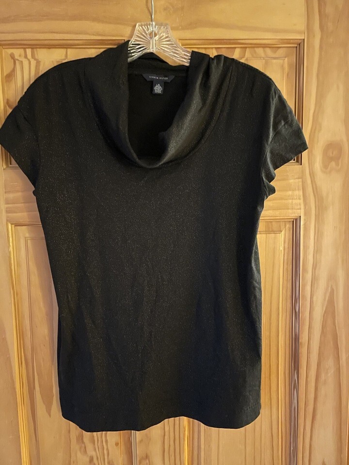 Elevate your wardrobe with this stunning Tommy Hilfiger top, perfect for any occasion. This metallic style blouse in black is sure to turn heads with its unique and trendy design. The size L garment fits regular and is made for women who want to stand out in the crowd. This piece is perfect for those who want to add a touch of shimmer and shine to their outfit without compromising on comfort.