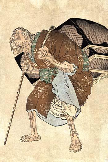 20inch x 30inch Poster Ukiyo-e print illustration showing an old woman(?) carrying a large basket on her back, a gift from the sparrow whose tongue she had cut; the basket is full of demons instead of the treasure she is expecting. Shitakiri suzume - There is a border around the image. Image size is correct.