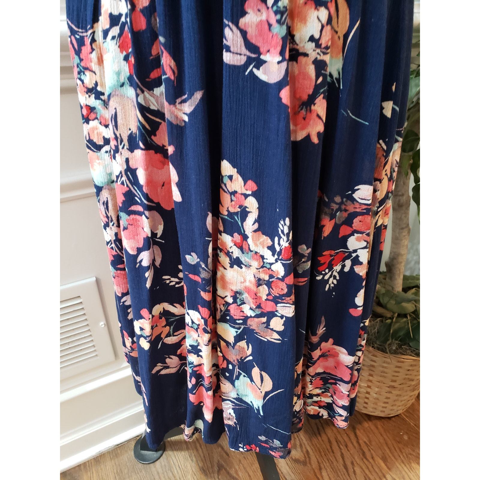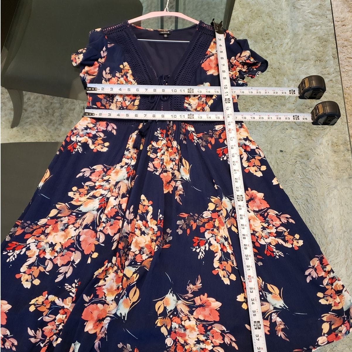This Torrid bohemian-inspired Large navy floral midi dress features a crochet lace bodice, flattering drawstring waist, and a flowy rayon skirt. Fully lined with polyester and designed with romantic flutter sleeves, this piece is perfect for garden parties, casual brunches, or vacation getaways.