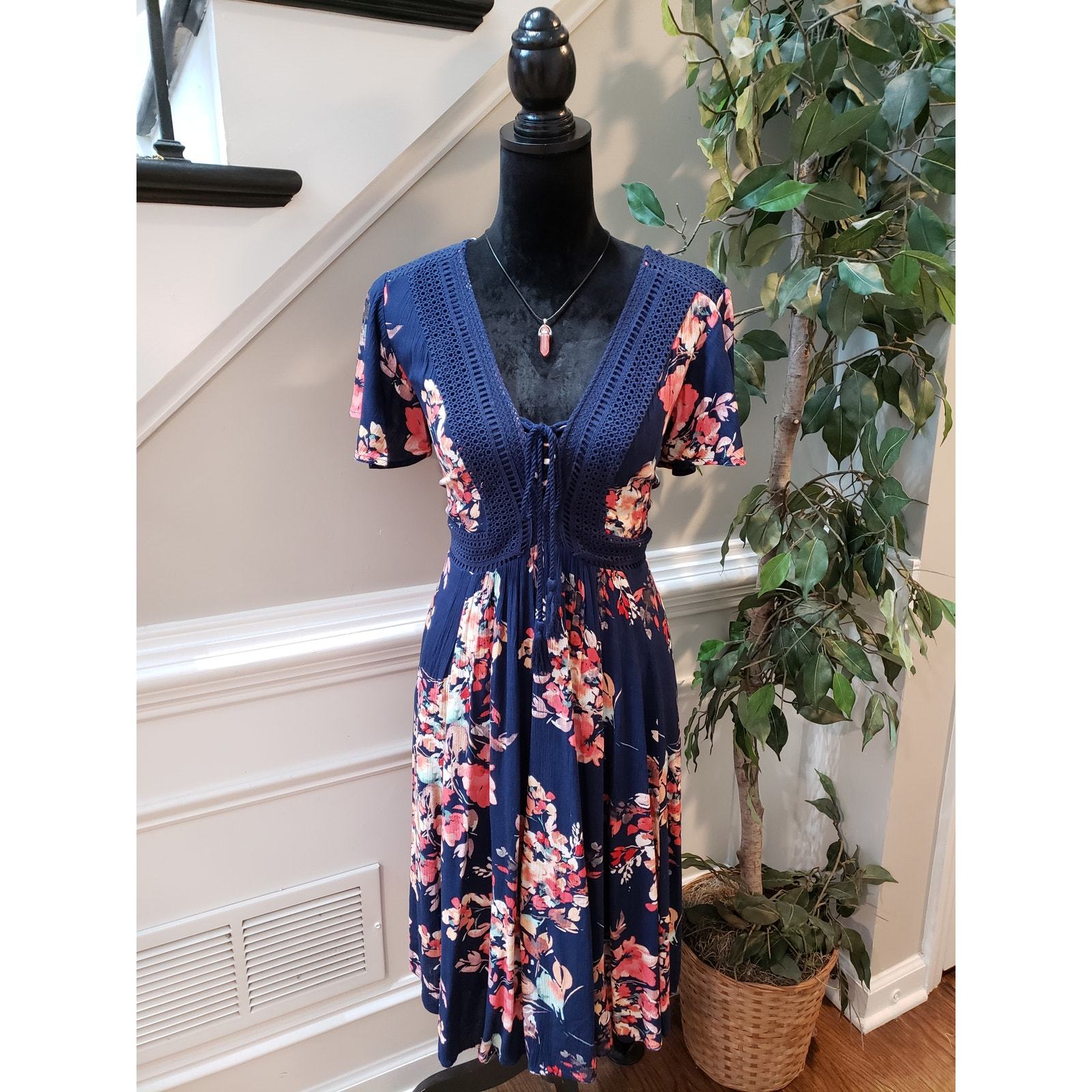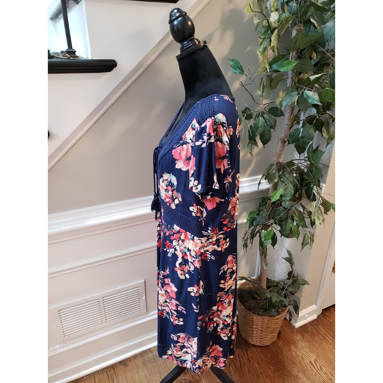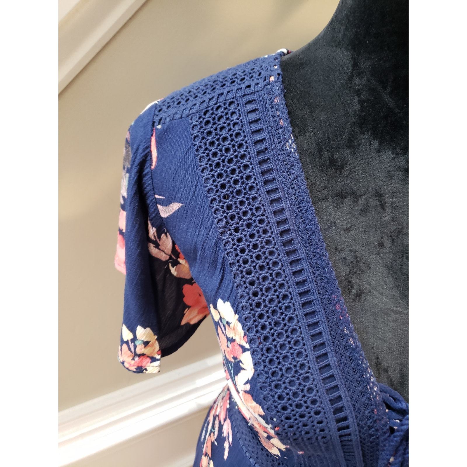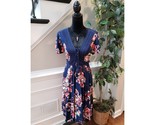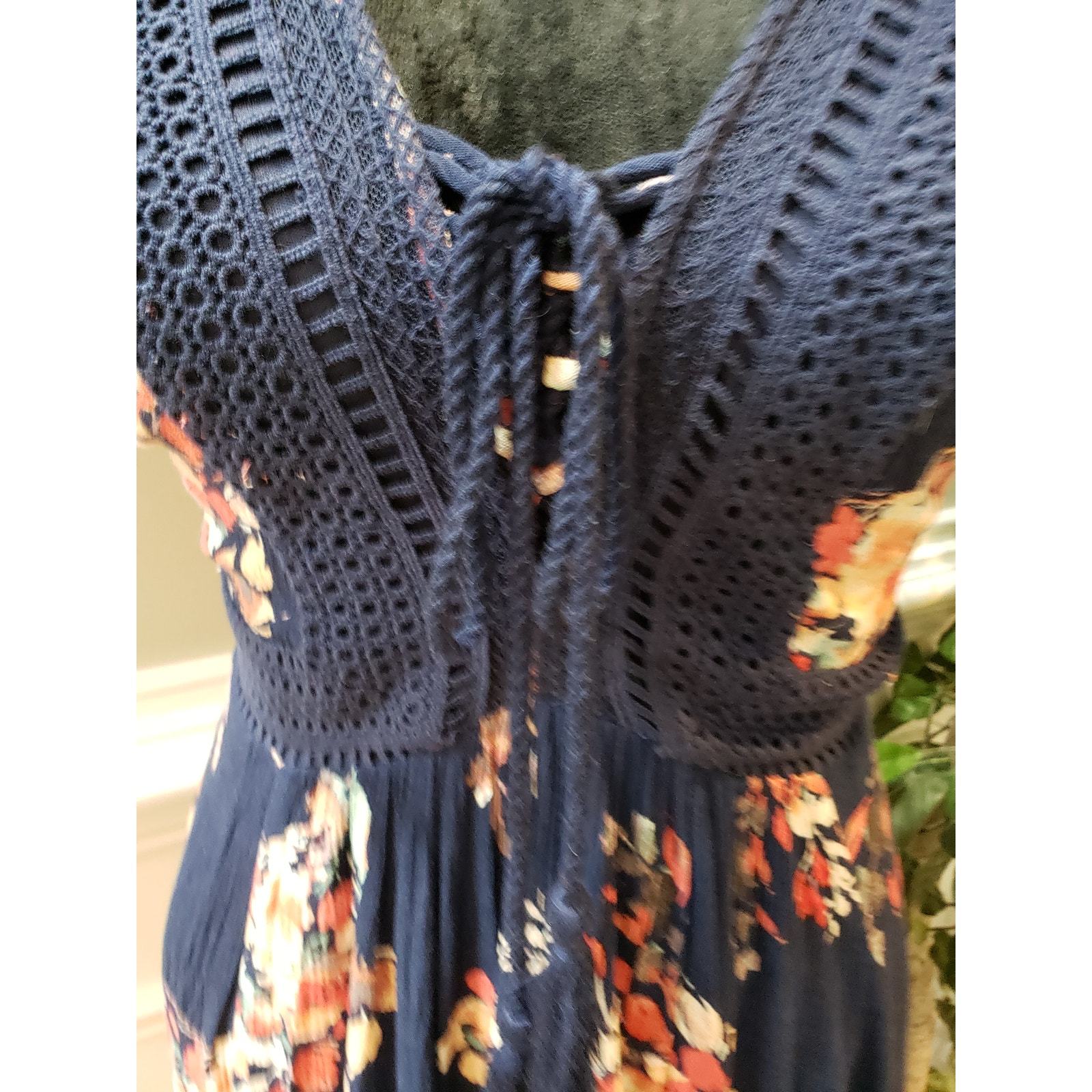 - Torrid Dress Navy Floral Size 00/L Crochet Lace Boho Midi Rayon Short Sleeve