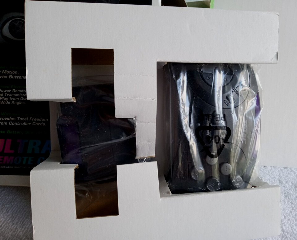 The Total Remote Sega Genesis Cordless Infrared Remote Controller Receiver is a black controller designed for the Sega Genesis console. It operates wirelessly using infrared technology. New in box{ box does have damage}.