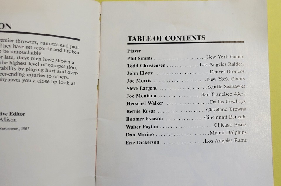 Touchdown! Great Offensive Players of NFL by Howard Balazar 1987 Paperback Book Phil Sims Walter Payton John Elway Dan Marino Boomer Esiason Joe Morris Todd Christensen Eric Dickerson Bernie Kosar Steve Largent Joe Montana Herschel Walker Book is in good, used condition with some signs of age, use and storage.