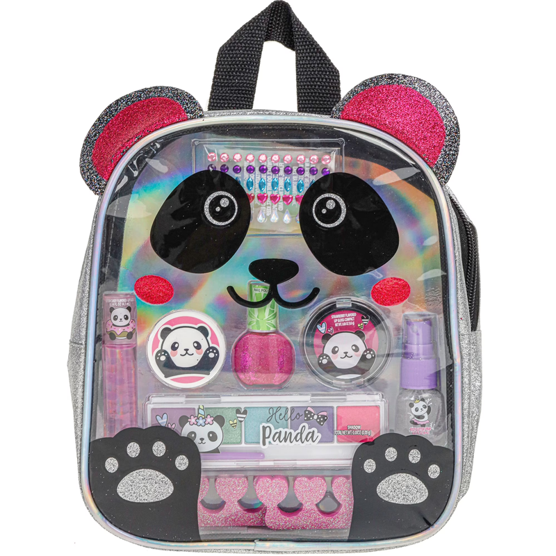 The Townley Girl seven piece panda bear inspired cosmetic makeup set is the perfect gift for that special tween in your life. She will love this adorable backpack filled with beauty essentials. Painting her nails and dressing up her lips never looked so adorable! This backpack is perfect for the back to school season or makes a great holiday gift solution. Fun and easy to apply, non-toxic nail polish and other cosmetics enables the girls to explore fashion and beauty safely. Our non-toxic, water based polish is easy to remove by simply peeling off the dried polish, so no need for harsh nail polish remover. Safe for children three and up. Comes with One Nail Polish Bottle, A Set of Nail Spacers, One Roll on Fragrance, One Body Glitter Spray, One Eye Shadow Compact Complete With Five Colors in the Palette, and One Lip Gloss Compact