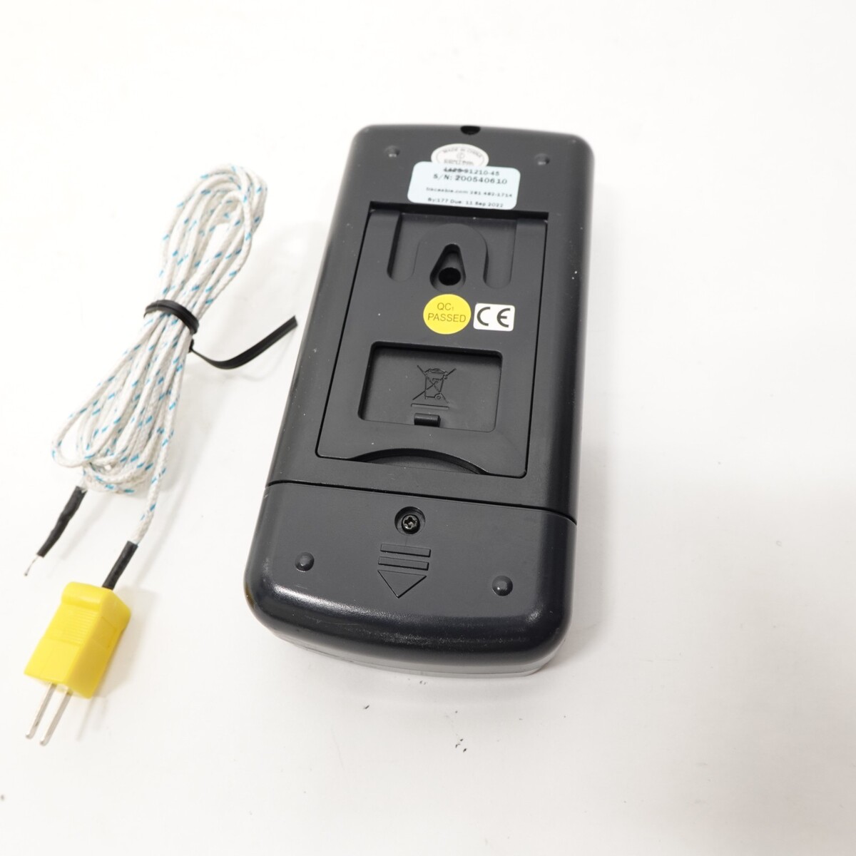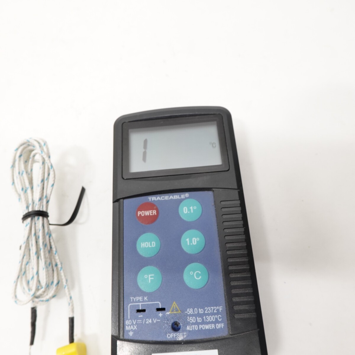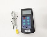 Traceable Type K Digital Thermometer Model: (Unlabeled generic Traceable handheld unit) Includes Type K thermocouple probe as shown. Unit powers on and reads temperature accurately when tested. Display, buttons, and backlight all function properly. Features: Temperature range: -58F to 2372F / -50C to 1300C Resolution: 0.1 / 1 selectable Functions: HOLD, F/C, auto power-off Works with Type K thermocouples (standard mini connector) LCD display with large readout Includes: Thermometer unit Type K temperature probe Calibration sticker from Boise Calibration (8/12/24, due 8/12/25) Condition Notes: Light cosmetic wear from prior use (see photos) Battery cover intact Clean battery compartment No cracks or damage Serial No: 2005040610