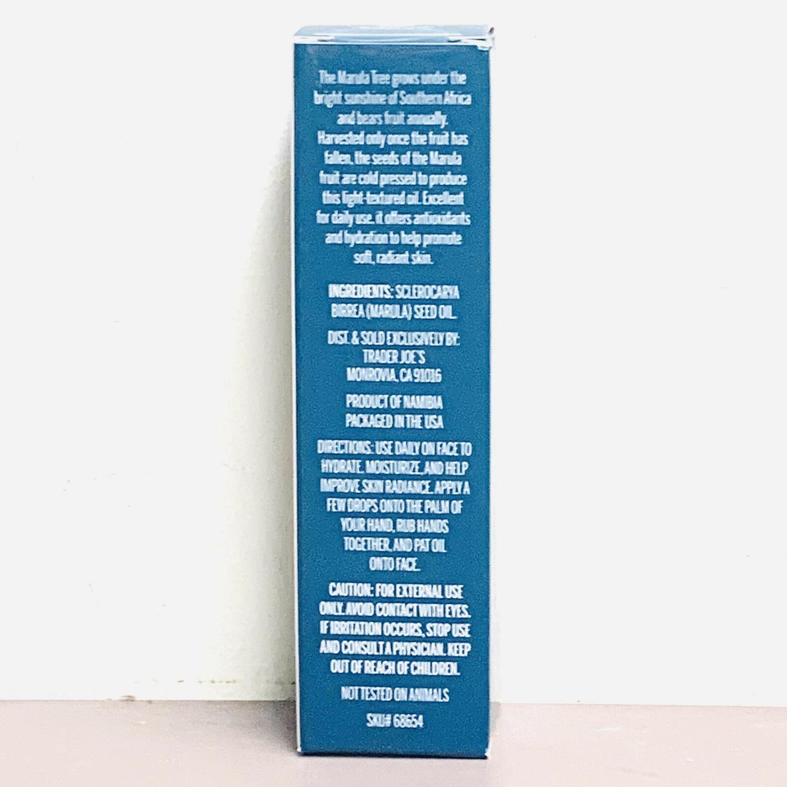 Product description: Trader Joe?s Marula Facial Oil is produced from the first cold-pressing of marula seeds. The oil is light-textured and not greasy. It?s especially good for hydrating skin. Marula Oil also offers antioxidants to promote a soft radiance?that glowing visage you?ve been hoping for!