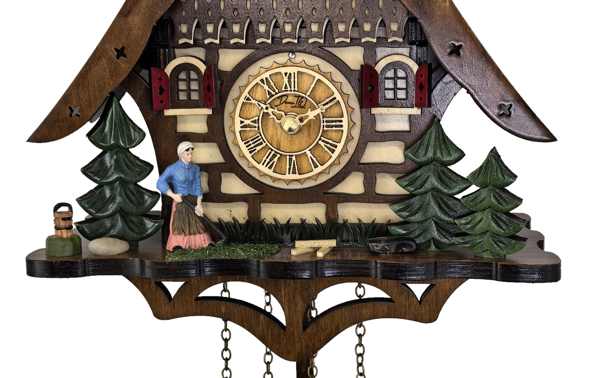 Unique Custom-Made Cuckoo Clock – A Timeless Piece of Artistry! Bring a touch of enchanting Black Forest tradition into your home with this one-of-a-kind, custom-handcrafted cuckoo clock. Inspired by classic German designs, this clock features intricate wood carvings and whimsical details that capture the essence of alpine folklore. Perfect for collectors, home decorators, or as a standout gift, this clock is not mass-produced—it's a bespoke creation made with attention to detail and high-quality materials. Key Features: Design Aesthetics: Shaped like a cozy chalet with a steeply pitched roof, detailed carvings, and red-shuttered windows. The roof includes a small door for the cuckoo bird to emerge. Below the clock face, a scenic platform showcases evergreen fir trees, a charming static figurine of a woman in traditional attire (blue dress, white headscarf, and pink apron) depicted farming with a hoe tool over a small patch on the ground, and a rustic barrel accent on the left side. Clock Mechanism: Reliable battery-operated quartz movement with a classic clock face featuring gold Roman numerals and hands. The cuckoo calls on the hour, with the bird emerging from the door, followed by one of 12 delightful melodies for added charm. Powered by 3 C-type batteries (not included) for easy, maintenance-free operation. Auto Night Shut-Off: Built-in feature that automatically silences the cuckoo sound during nighttime hours to ensure peaceful sleep without manual intervention. Weights Pendulum: Two hanging chains with black pinecone-shaped weights and a brass leaf pendulum for an authentic traditional look—these are decorative elements that enhance the classic feel without requiring manual winding. Materials: Crafted from premium wood with a rich brown finish, hand-painted accents, and durable metal components for the chains and hardware. Condition: Brand new, custom-built, and fully functional. Tested for accuracy and smooth operation. This custom cuckoo clock blends functionality with folk art charm, making it a conversation starter in any room. Whether you're adding to your collection or seeking a unique decor item, this piece evokes the magic of the Black Forest without leaving home. Watch a demonstration of this item: https://youtube.com/shorts/s5zzTi-6qKM