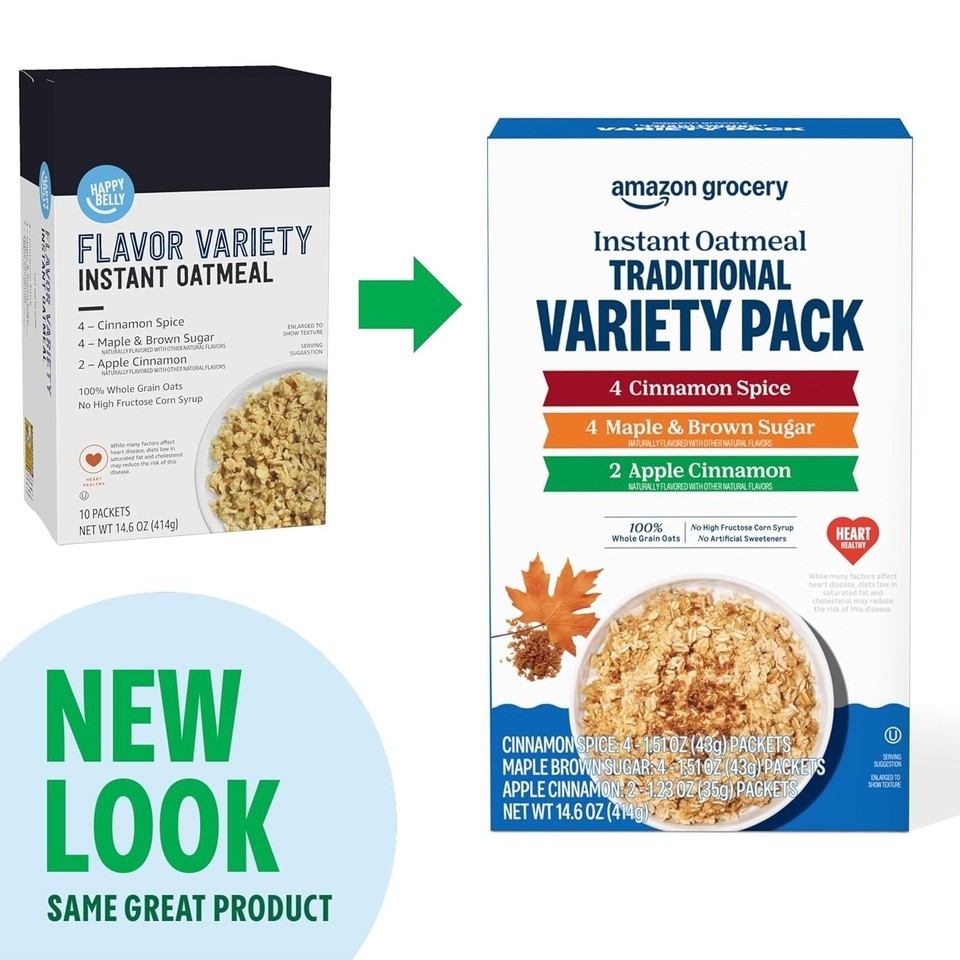 Traditional Variety Instant Oatmeal, 10 Count, 14.6 oz (4 Cinnamon Spice, 4 Maple Brown Sugar, 2 Apple Cinnamon), Previously Happy Belly, Packaging May Vary