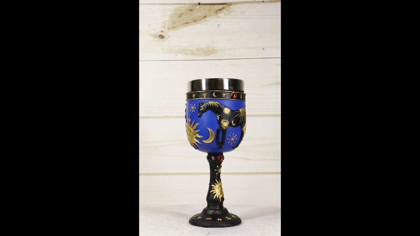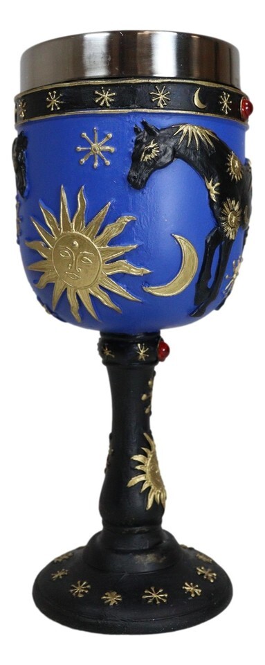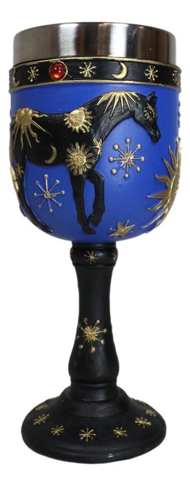 ? A celestial masterpiece of equine art and function! This goblet shows off black horses accented in golden suns and stars and moons, on a deep blue backdrop. More stylized celestial bodies in shining metallic can be seen, and gems glitter to add extra sparkle. Inside, a stainless steel goblet makes for easy cleaning. A great gift for a horse lover!
