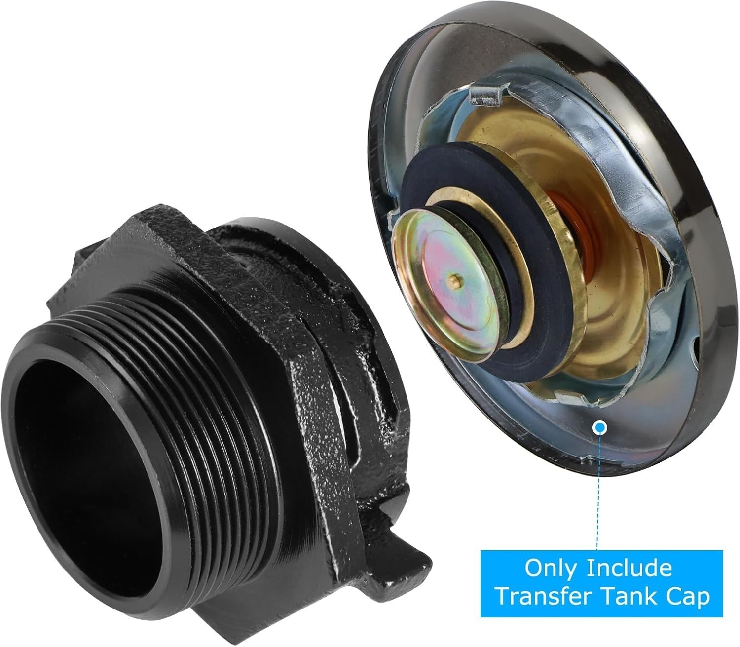 Transfer tank vented cap replace for Dee Zee Fill-Rite venting pressure tank cap and fit for standard 2" NPT threaded tank bung base. Diesel tank cap works well for ground, farm, commercial and distillate tanks, such as transfer tank, fuel tank, gas tank, diesel tank, auxiliary fuel tank, mobile fuel tank and weather guard tank.