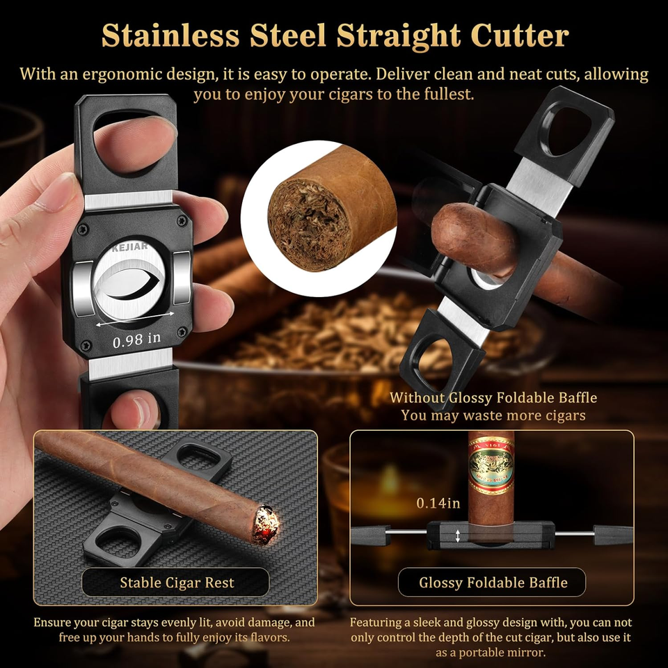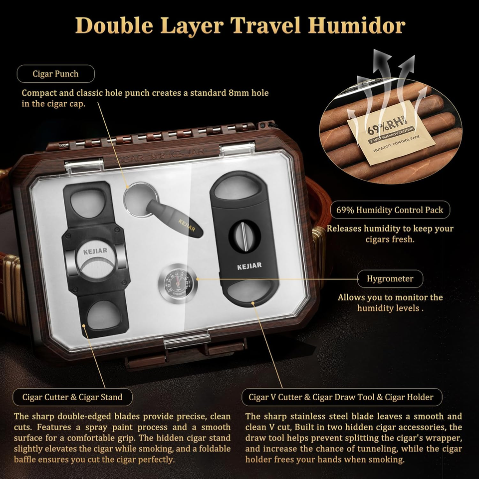 Travel Humidor Set: The KEJIAR Travel Cigar Humidor Set is expertly designed with a double-layer structure, combining essential tools for cigar enthusiasts. Included in the set are a sharp V-cutter with a cigar holder and draw enhancer, a smooth straight cutter with a cigar stand, and a compact cigar punch. The top layer conveniently stores all accessories, while the bottom layer accommodates up to five cigars. Measuring 8*2.16*2.48 inches and weighing just 440g, this lightweight humidor is easily portable, making it ideal for travel in suitcases or backpacks. Professional Cigar Protection: Crafted with a transparent acrylic window and a durable ABS body, this humidor is pressure-resistant and shatterproof. It features sturdy clasps and a sealing ring that ensure superior airtightness and impact resistance, preserving the original aroma of your cigars. The interior is lined with hand-polished cedar wood, providing a natural environment to keep your cigars mellow and fresh. This allows you to travel with confidence, enjoying outdoor activities without worrying about your collection. Ideal Humidity System: The built-in hygrometer allows you to monitor humidity levels effortlessly, preventing your cigars from drying out or becoming overly moist. Accompanied by a 69% two-way humidity control pack, it maintains the optimal humidity range for your cigars. This pack requires no activation and eliminates concerns about liquid leakage, ensuring that your cigars remain fresh and flavorful throughout your journey. Enjoy peace of mind knowing your cigars are stored in top condition, no matter where you are. Multifunctional V Cut Cigar Cutter: The included V cutter features a built-in cigar draw enhancer tool and a hidden cigar holder. Its sharp stainless steel blade provides a precise 0.82-inch deep V-shaped cut with ease. The 1.77-inch long draw enhancer offers reliable support for your cigars and can clear any blockages while smoking. Additionally, the 0.7-inch diameter cigar stand allows for easy lifting of your cigar without the need for extra tools. This versatile V cutter enhances your cigar experience to the fullest. Unique Cigar Cutter Cigar Punch: The 2-in-1 straight cutter boasts a 0.98-inch diameter double-blade guillotine for precise cuts, accommodating up to 64 ring gauge cigars. Its 0.62-inch diameter concealed cigar stand keeps your cigar elevated, while the innovative flip-top acrylic baffle prevents over-cutting, ensuring the perfect cut every time. The compact puncher creates a clean 8mm hole and measures just 0.55*0.55*1.69 inches, making it easy to carry and even hang as a decorative piece for cigar aficionados. Magnificent Gift Set: With its stylish exterior and innovative design, this travel cigar humidor is compact and portable, featuring a wrist strap for easy transport. It not only provides exceptional sealing but also comes with a professional cigar accessories kit, enhancing the overall experience for any cigar lover. Packaged in an elegant gift box, it makes for the perfect gift for occasions such as birthdays, Christmas, and Father's Day. Top-Notch Customer Service: Each component of this cigar accessory set has undergone rigorous inspection to ensure quality.