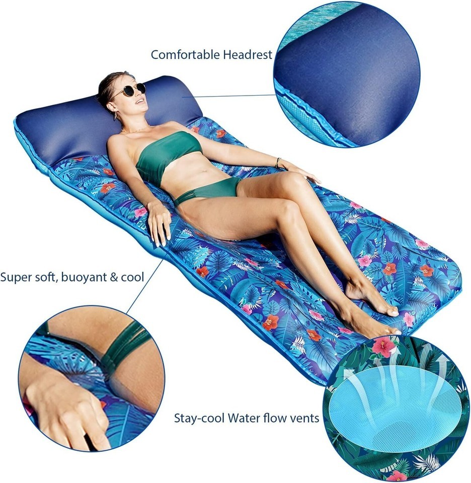 Experience ultimate relaxation with our Luxury Floating Lounger, designed for optimal comfort and style. The innovative 2-in-1 design mimics lying on a soft bed, complete with a headrest for full support. Crafted with breathable fabric and mesh, it keeps you cool and comfortable, perfect for sunbathing and enjoying pool parties, beach days, or lake trips. The interior cooling holes balance water flow to prevent tipping and maintain stability, while the vinyl chambers ensure durability. Oversized for adults and teens, with a weight capacity of up to 350 lbs, this lightweight, foldable float is ideal for travel, easy to inflate, and quick to dry. Elevate your summer leisure with FindUWill.