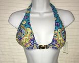 Trina Turk Corsica Halter Top Bikini Swim Turquoise Inspired by the rich hues of the Mediterranean, the Corsica Buckle Front Halter is a chic option for your sunny weather destination. With gold hardware detail, this print has distinct flair like it's namesake. 82% Nylon, 18% Elastane. Ties at neck and back bikini top. Gold hardware detail at front. Removable soft cups. This swimsuit is perfect for summer, swimwear, beachwear, beach party, pool party, vacation. Include: top piece only Imported. Hand Wash.