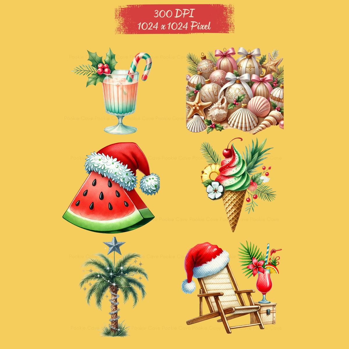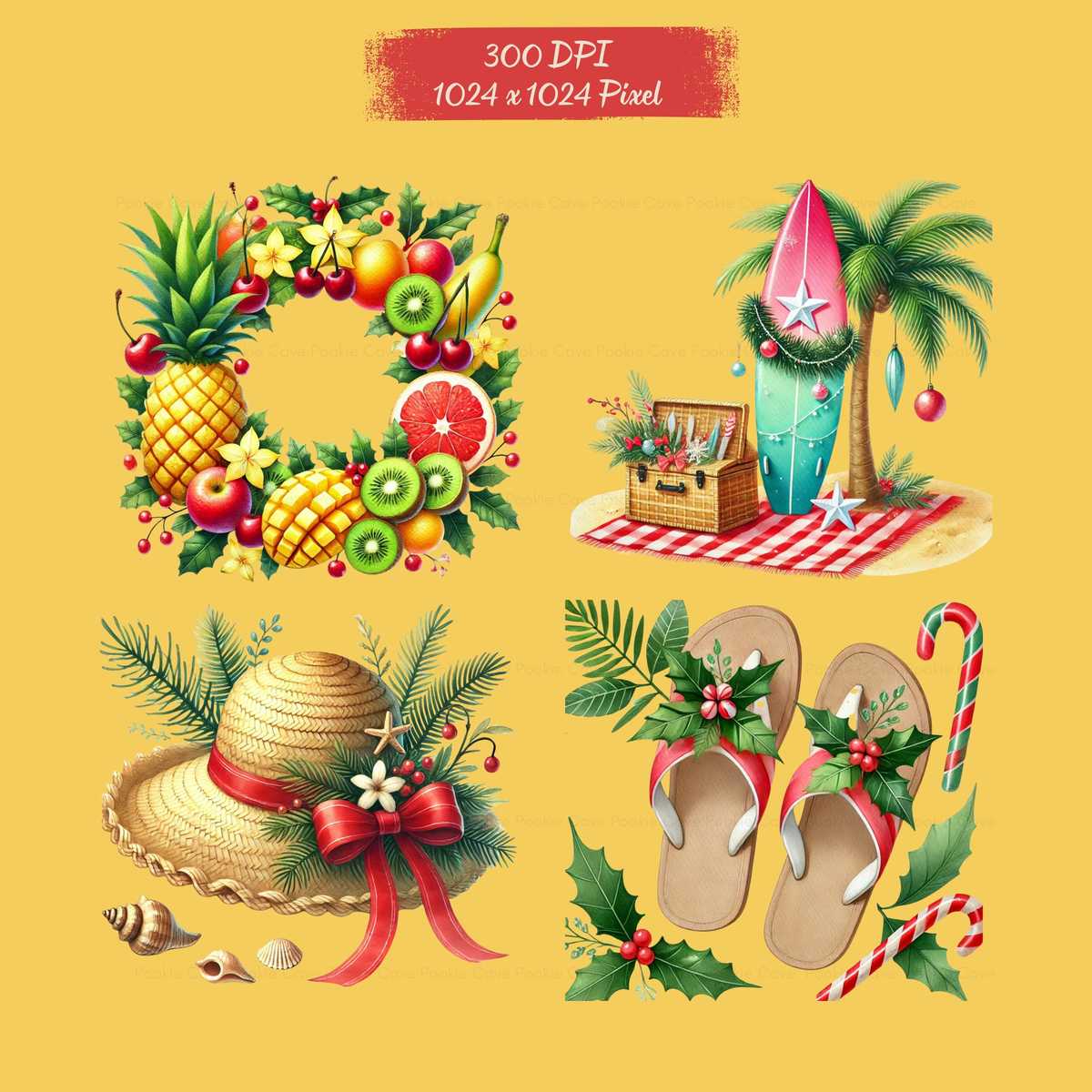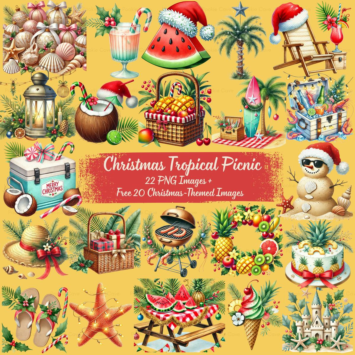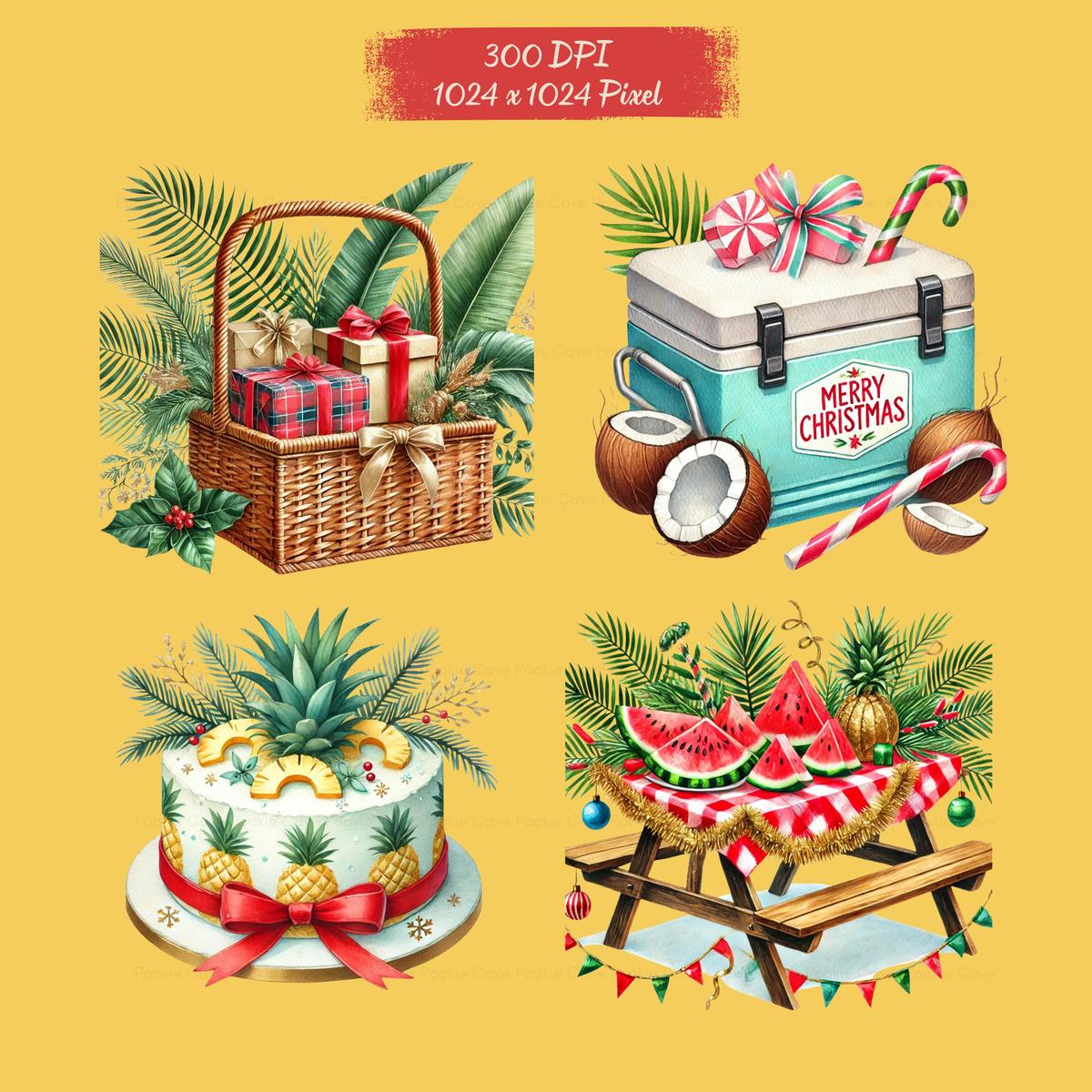 Celebrate Christmas under the sun with this Tropical Picnic Watercolor Clipart Bundle!This unique summer-inspired collection combines coastal holiday vibes, beach picnics, tropical fruits, and festive cheer. Perfect for stickers, sublimation designs, greeting cards, digital planners, posters, scrapbooking, or home décor prints.
