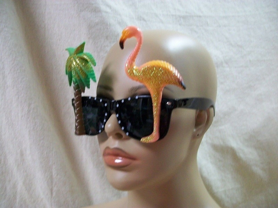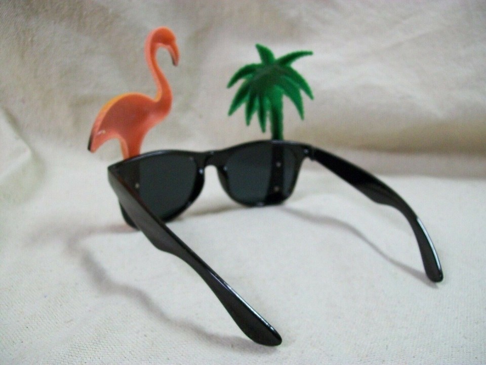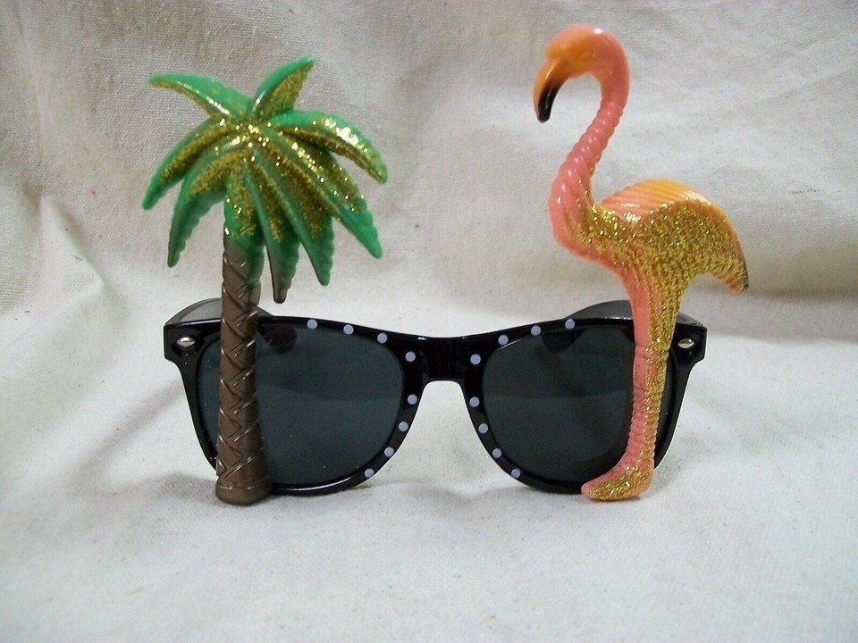 Wacky Tropical Plastic Costume Sunglasses. The lens have attached palm tree on one side and a flamingo on the other side. Whether you're in your parrothead garb and on your way to a Jimmy Buffett concert, chillin' with a Boat Drink in Margaritaville, or heading to a Luau for a Cheeseburger in Paradise - You'll be the life of the party with the party glasses. One size fits most. Novelty Sunglasses for cosmetic use. Does not provide any vision correction.