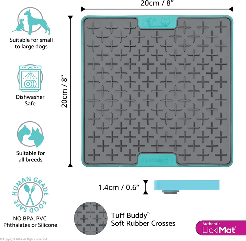 New TUFF series: Chew-resistant, non-slip rubber feet and 100% dishwasher safe. Same soft Authentic LickiMat rubber surface for pleasurable licking action and healthier teeth, gums and fresher breath. Gentle on your pet?s tongue. The tough LickiMat. Developed and recommended by Vets.